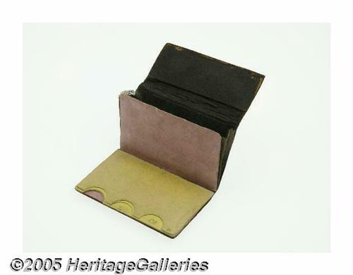 <B>Fractional Currency Wallet.</B></I> A paper, leather and cardboard wallet, marked "postage currency" on the flap and divided inside for 5¢, 10¢, 25¢ and 50¢ notes. Collectors have searched for these for years and only about 20 are known.