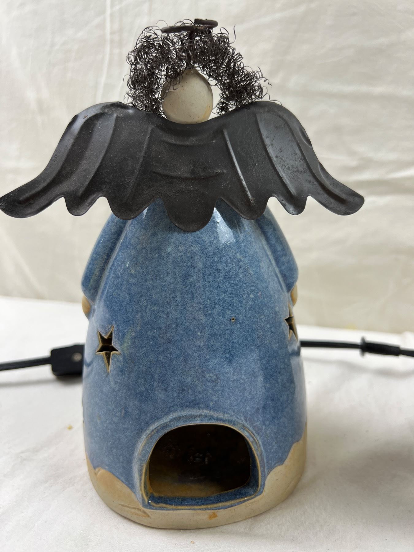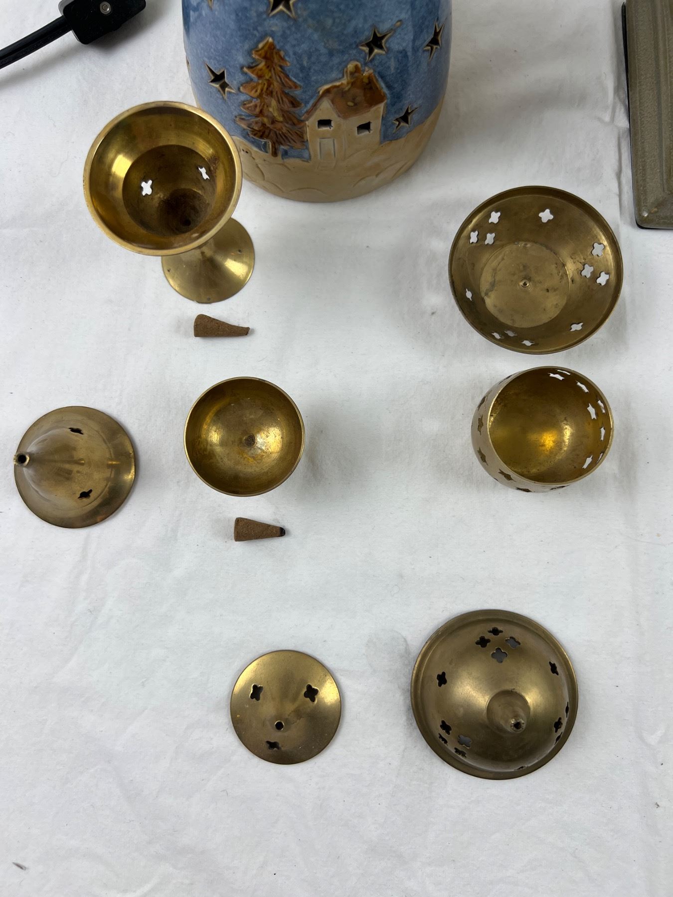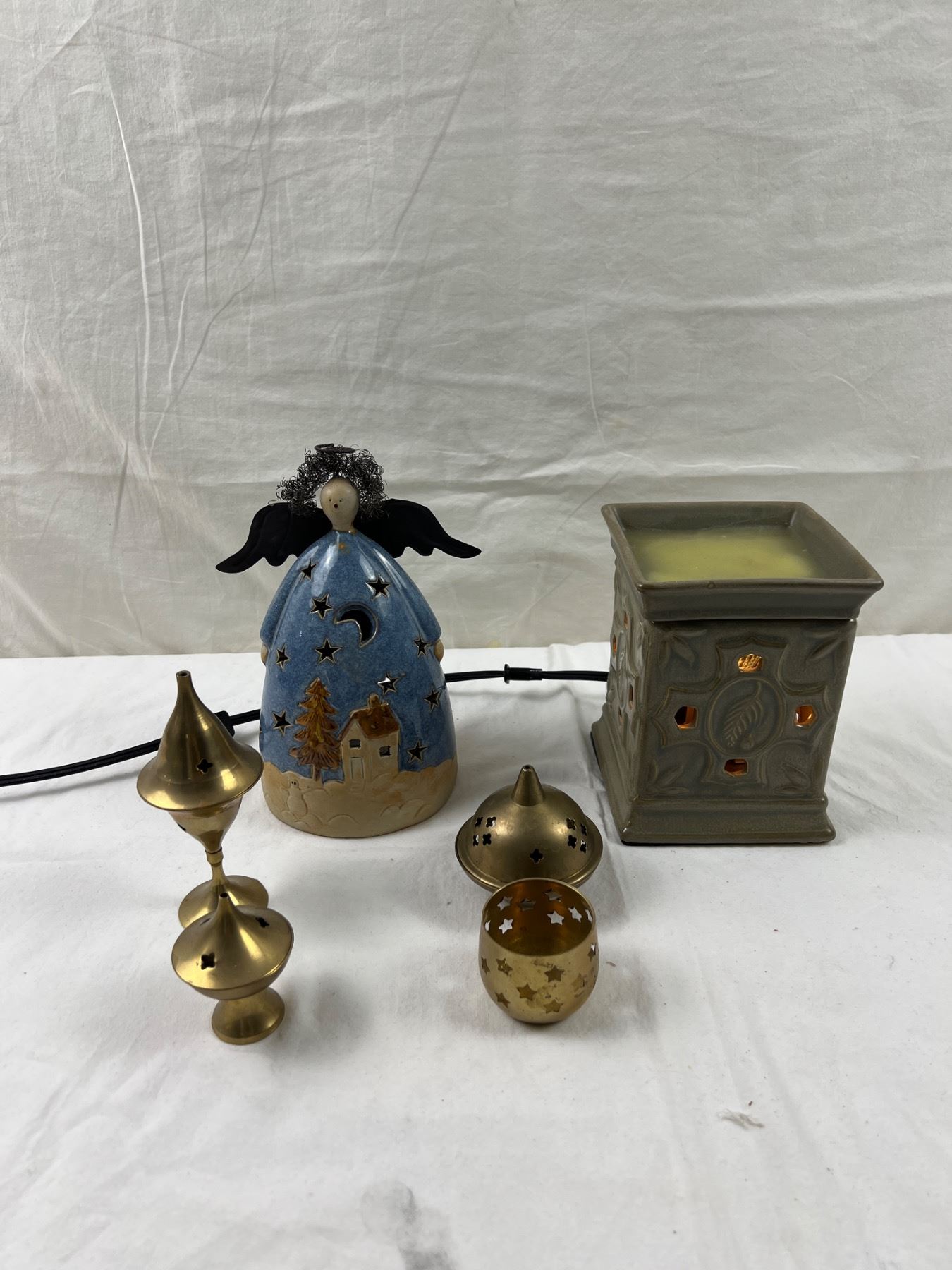 Tea light angel is 8" tall. Largest incense burner is 2" in diameter and tallest is 6". Bulb of wax warmer works.