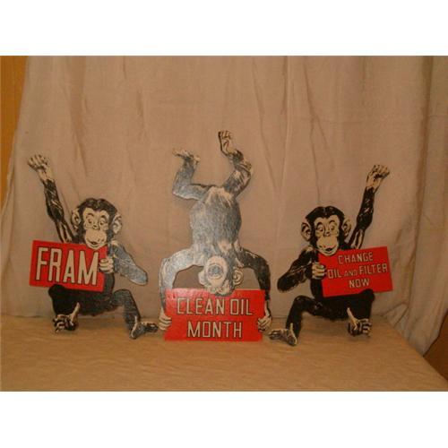 Fram advertising display with 3 monkeys is a rare find in unused condition. The first monkey holds a sign FRAM and the hole to hang him has never been punched out, he has a slight bend in his foot and leg ( 15"X 10"). The middle monkey goes upside down and the hole has not been punched out with a small rub on the sign edge just from years of storage ( 16"X 8.5"). The third monkey has a toe that has been bent from storage but again has not been punched (14.5" X 9.5". The monkeys are double sided and in near mint condition marked form AH 915 litho in USA & copyright 1956 by FRAM corp. providence. The picture of the middle monkey is just light reflection.