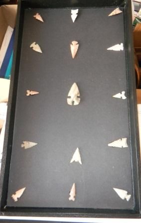 Frame with 15 fine arrowheads from Missouri. Measuring one to one and one half inches. Good condition with pit damage on one point. Shipping $18.00