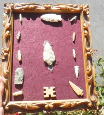 Frame of Adena Points and Bone beads. Thirteen total pieces. Includes a bone frog effigy and gem quality bird point. Shipping $12.50