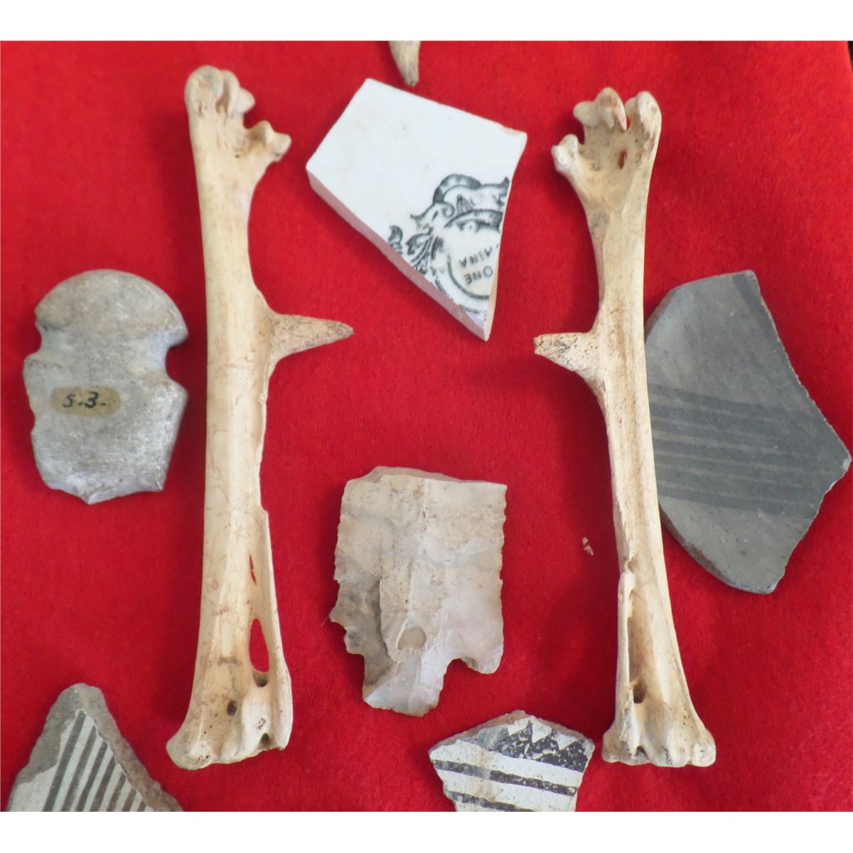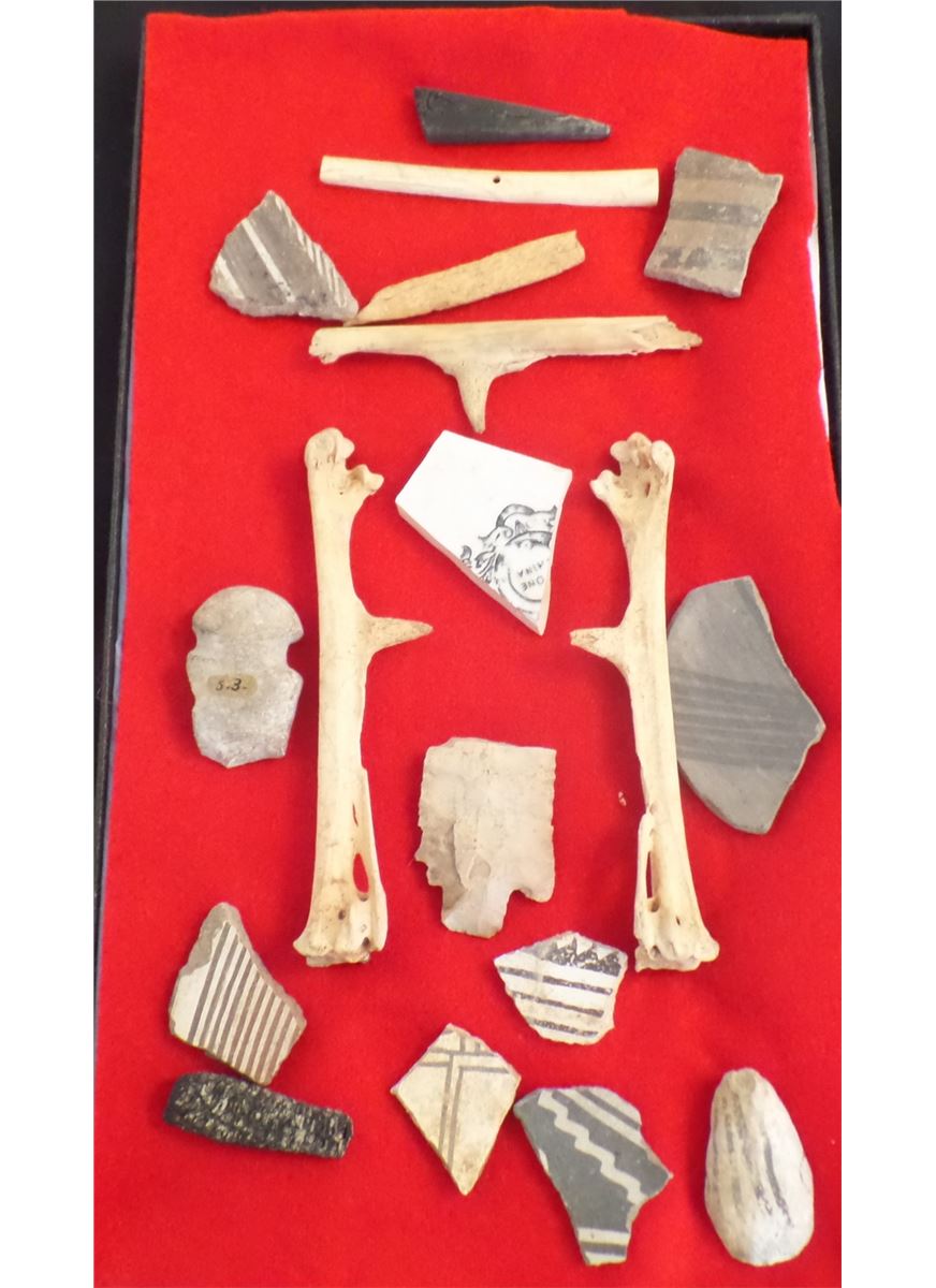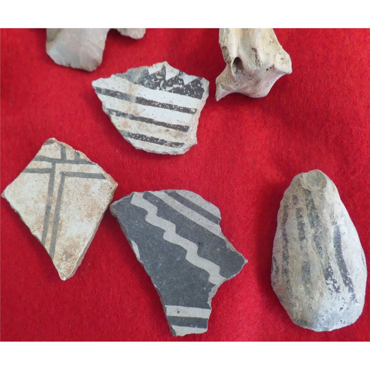 Frame of Anasazi Artifacts consisting of Spanish rooster leg bones, pottery fragments and other artifacts. Frame not included. As found condition. See pictures Shipping $14.50