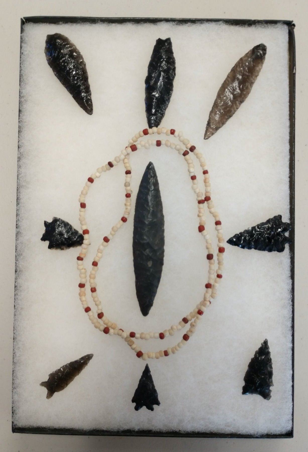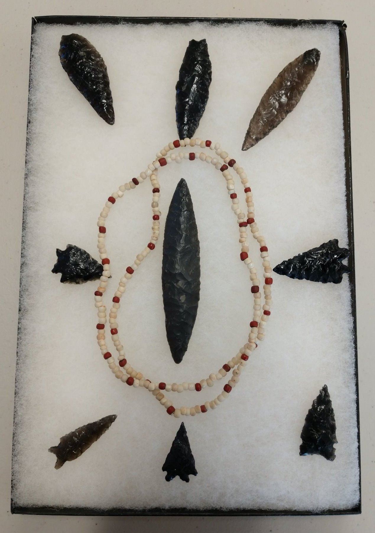 Frame of Museum Quality Points, pre-historic items. Made of obsidian and glass beads, the longest point measures 4 1/4", necklace is 30". Klamath Falls, Oregon. Hudson Bay trade beads, some translucent points with parallel flaking. Frame not included. Condition: Good, see images. Shipping: $25.50 w/insurance and signature.