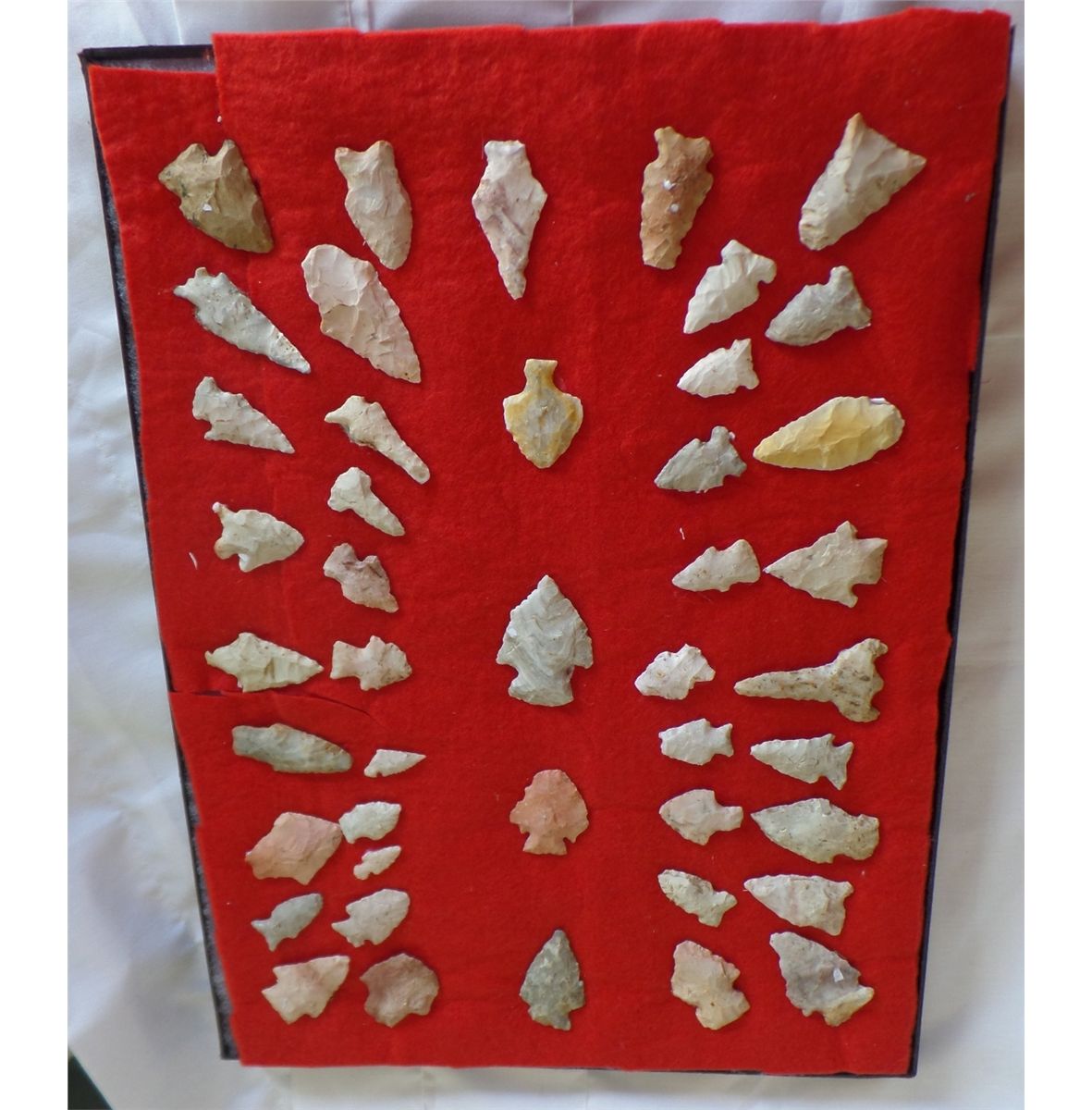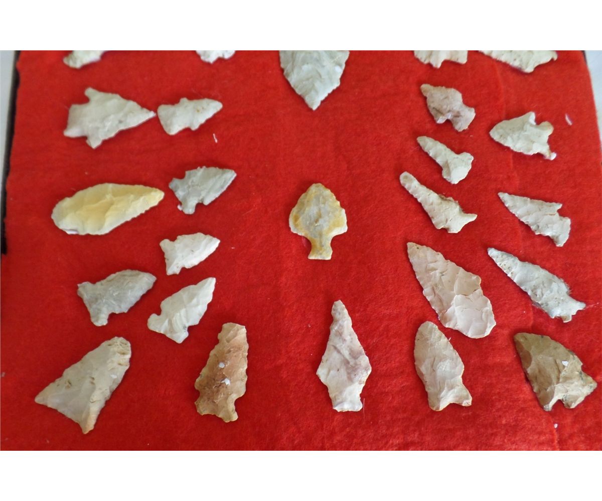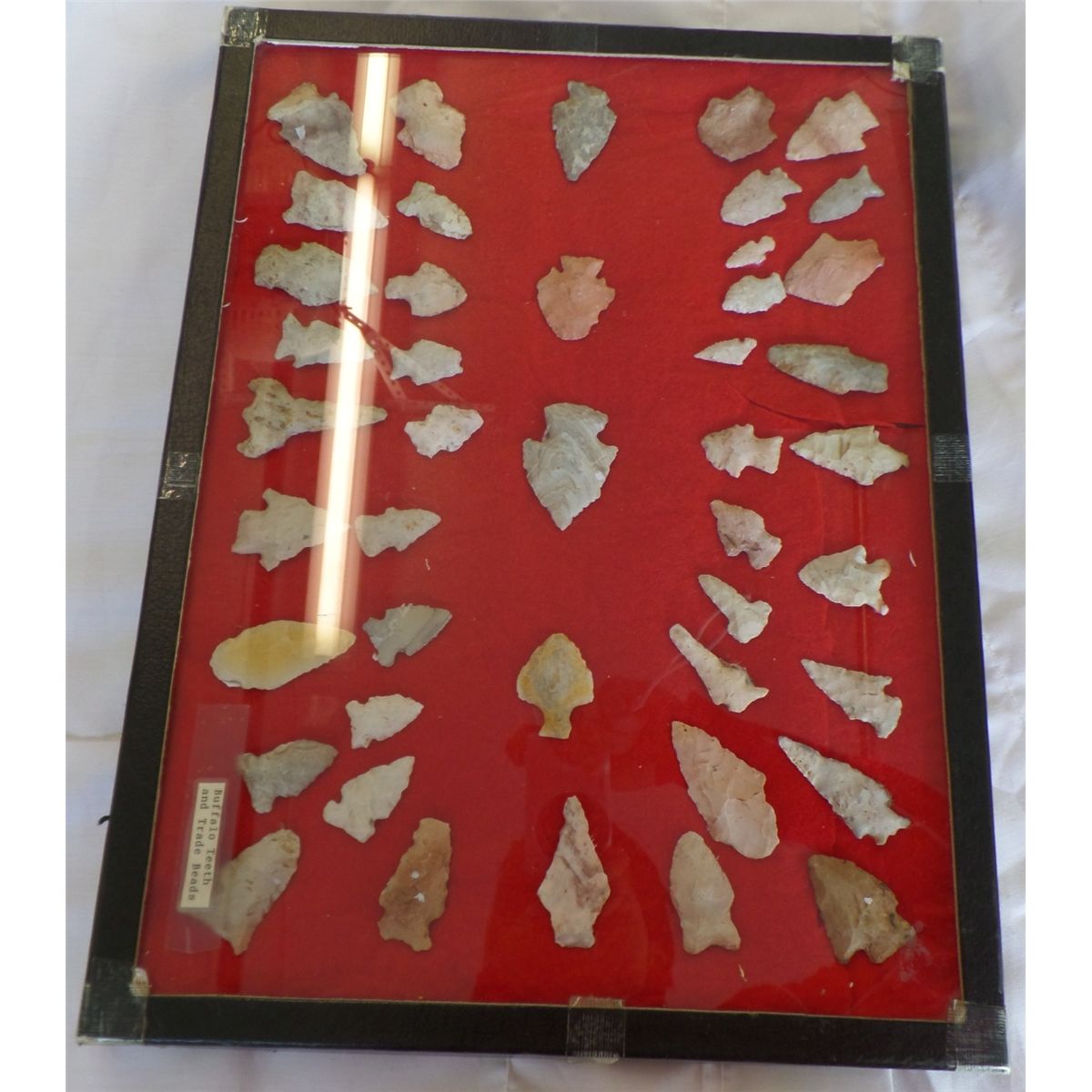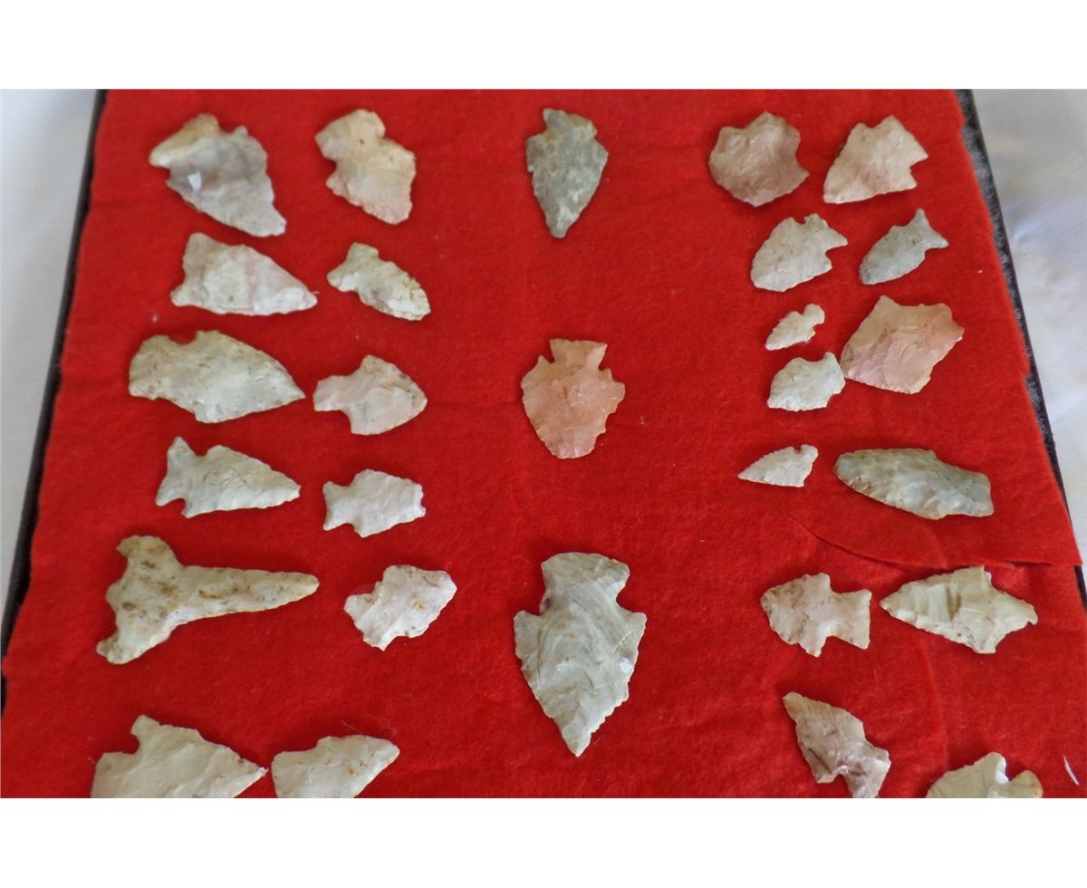 Frame of Native American Points. Includes 44 points. Sizes are .5" - 1.5" wide, and 1" to 2.25" long. Points are from a buffalo kill site, St. Louis County, MO, USA. Frame is 16.5" x 12". Condition: As Found. Shipping: $22.
