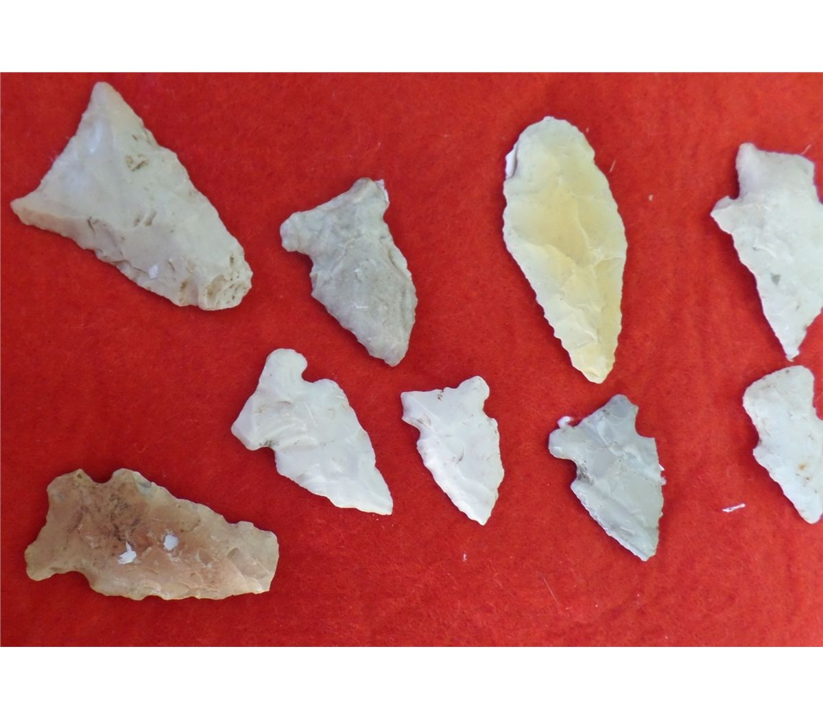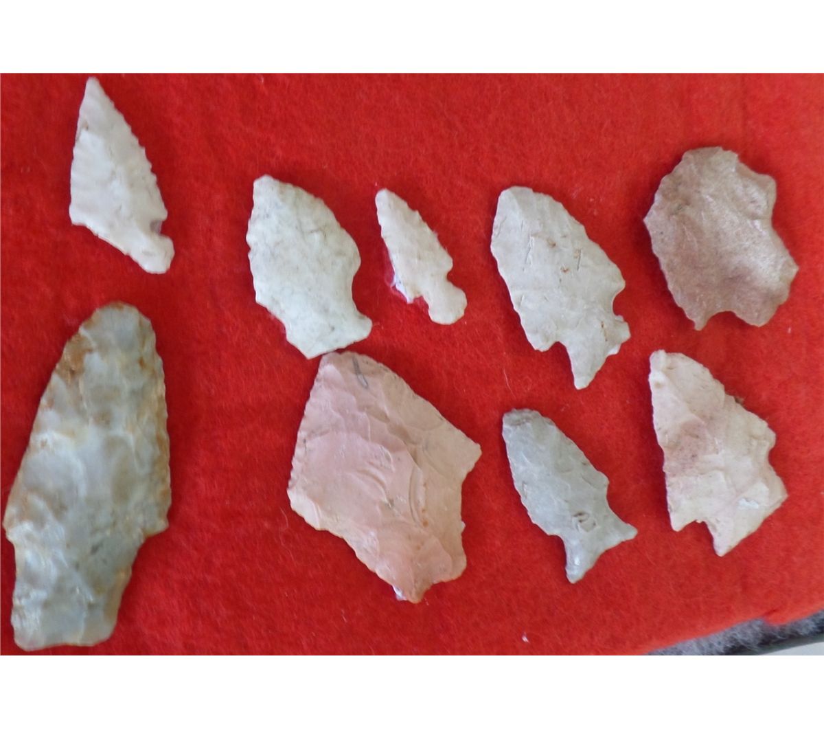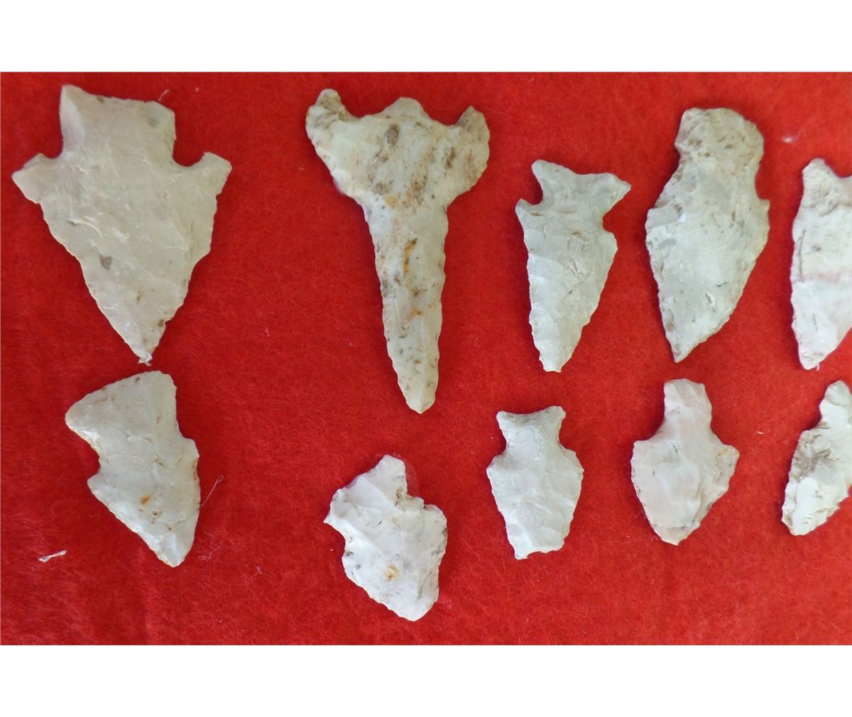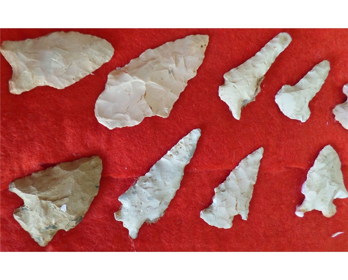 Frame of Native American Points. Includes 44 points. Sizes are .5" - 1.5" wide, and 1" to 2.25" long. Points are from a buffalo kill site, St. Louis County, MO, USA. Frame is 16.5" x 12". Condition: As Found. Shipping: $22.