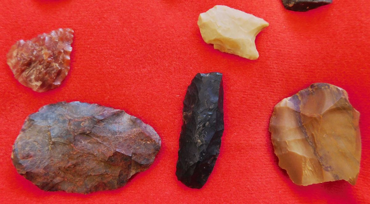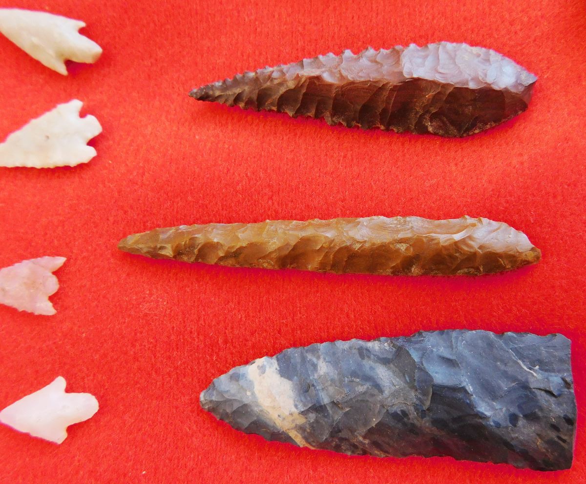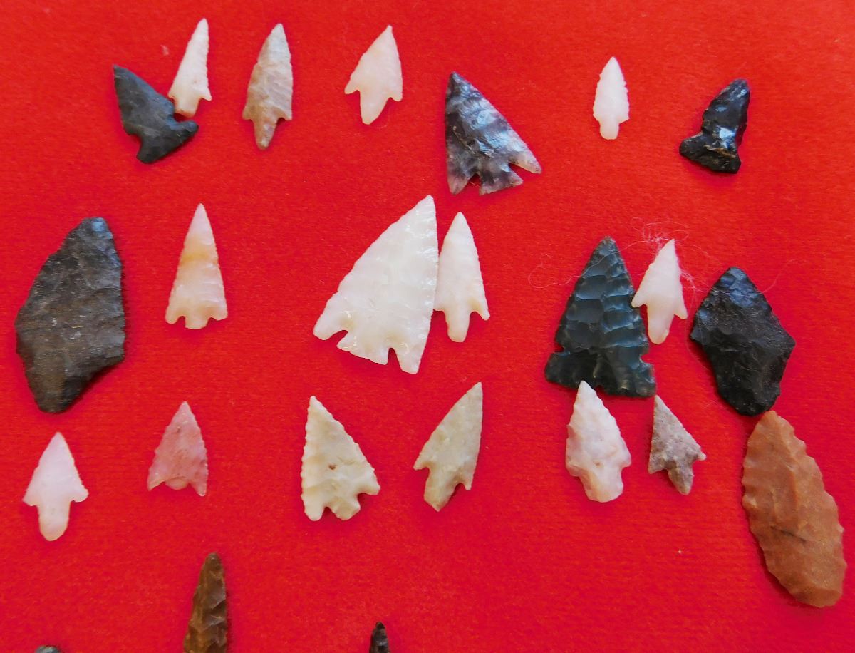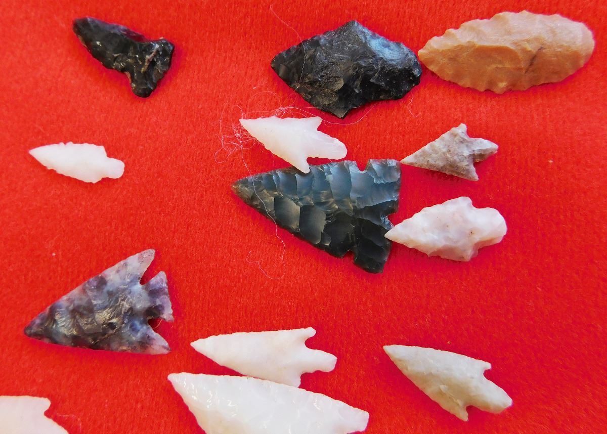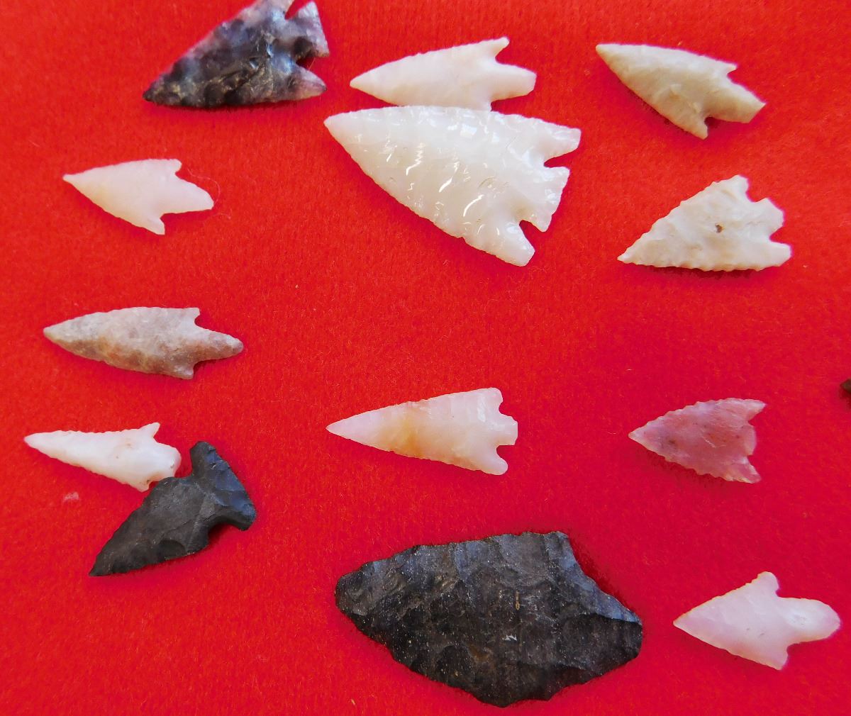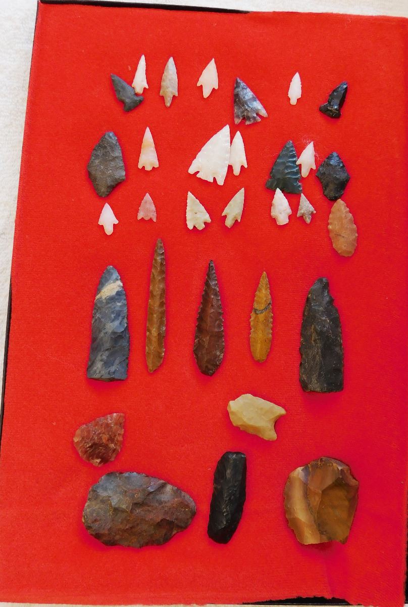 Frame of Oregon Flint, pre-historic items. Consisting of chert, agate, quartz and obsidian, these items range from 1" to 2.5" in size. From Klamath Falls, Oregon. Frame not included. Condition: Some points damaged, see images. Shipping: $18.50.