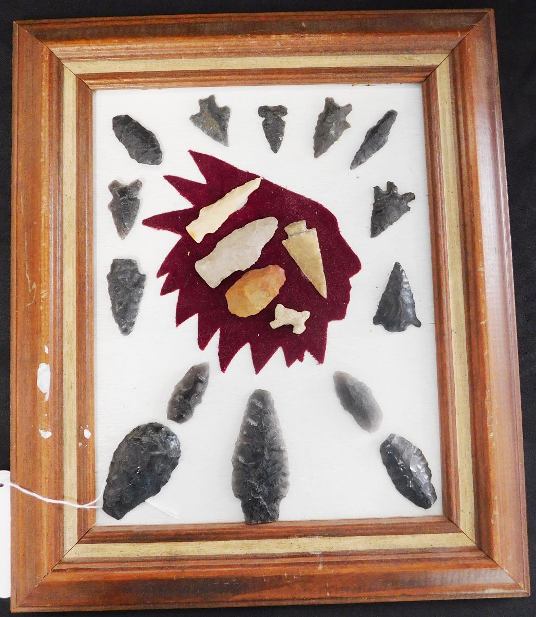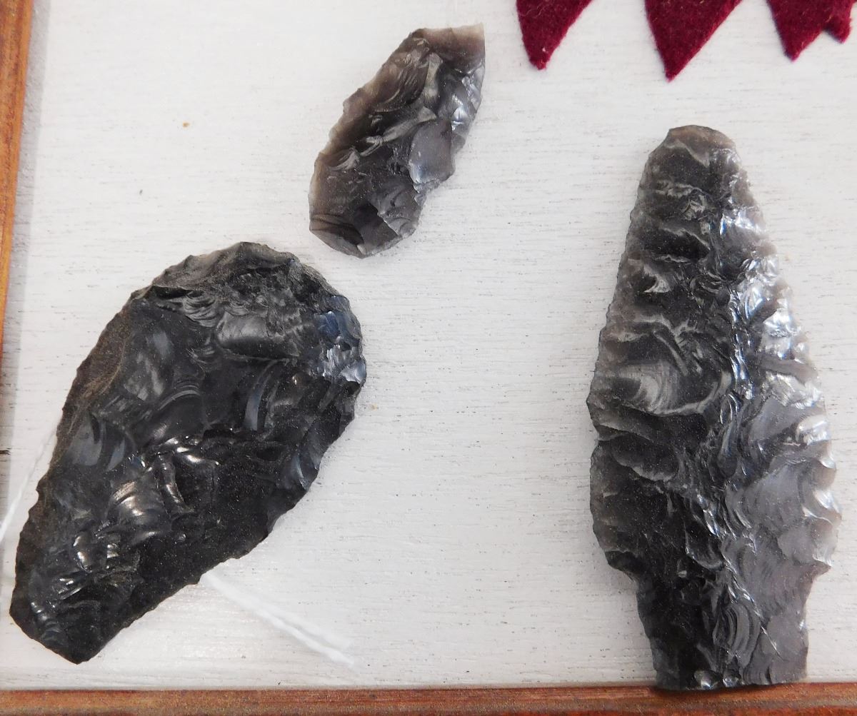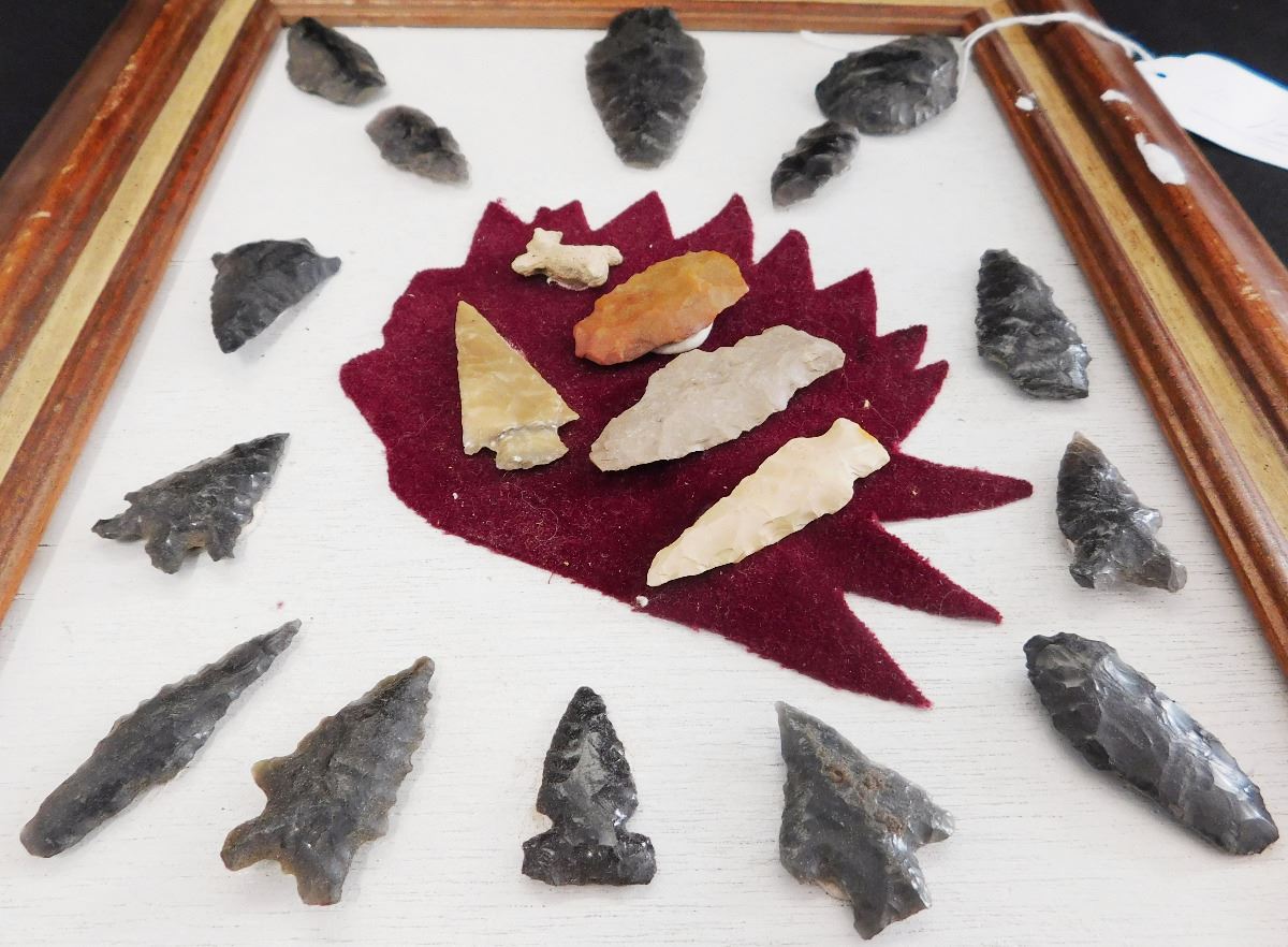 Frame of Oregon Points, pre-historic items. Made of obsidian, chert and agate. They measure approximately 1 to 2.5 inches. These items are from Klamath Falls, Oregon. The frame does not have glass and is included. Condition: Items are as found, see images. Shipping: $19.50.