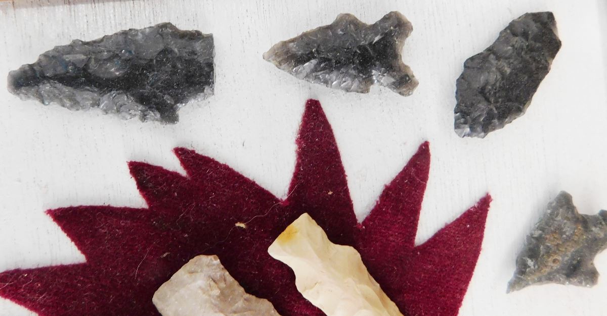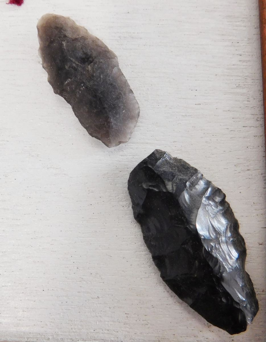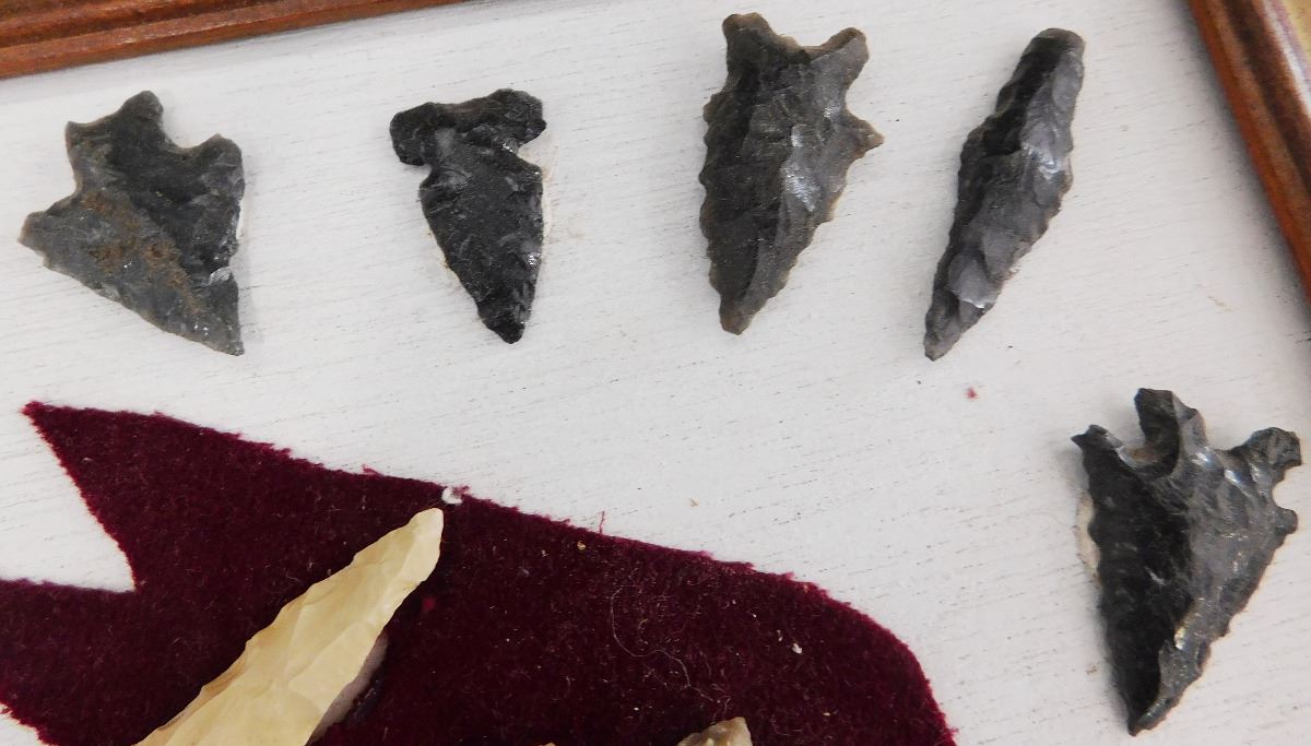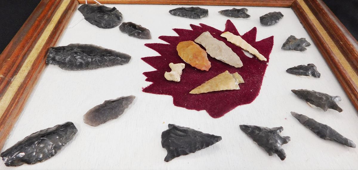 Frame of Oregon Points, pre-historic items. Made of obsidian, chert and agate. They measure approximately 1 to 2.5 inches. These items are from Klamath Falls, Oregon. The frame does not have glass and is included. Condition: Items are as found, see images. Shipping: $19.50.