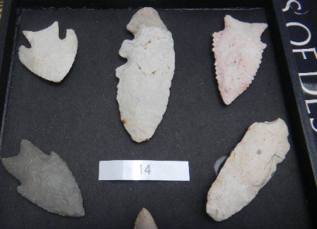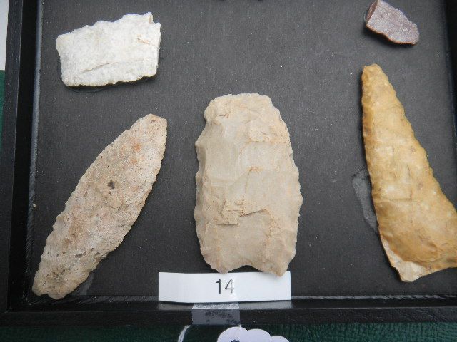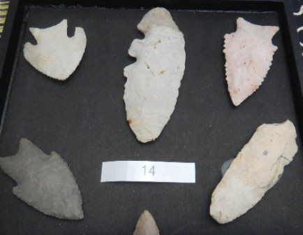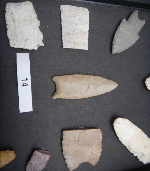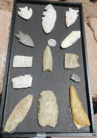 Frame of Paleo and flint including a three inch perfect Clovis point. There are 13 pieces in this Texas collection. The size is from one to four and half inches. Some points are only partial. 1000 AD to 9000 BC. Shipping $15.00Fair condition on partial points. Perfect condition on the Clovis point