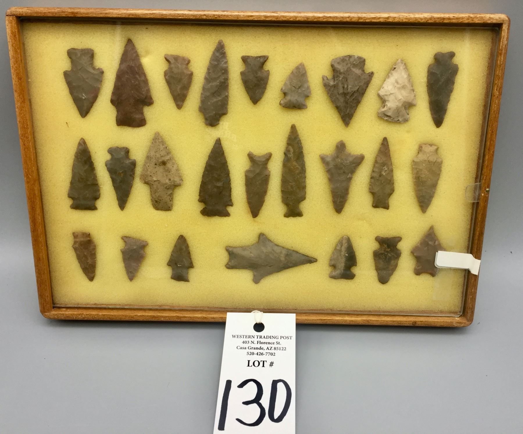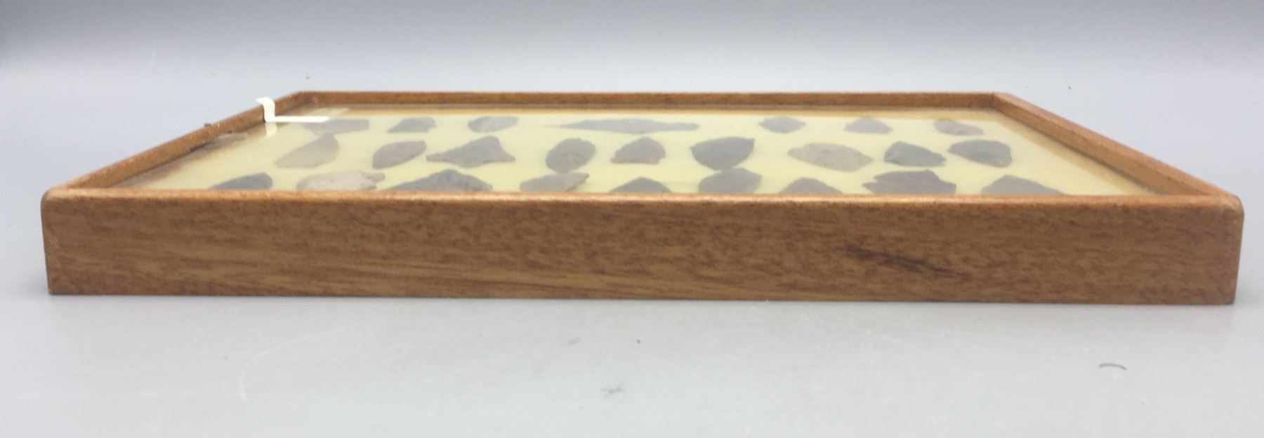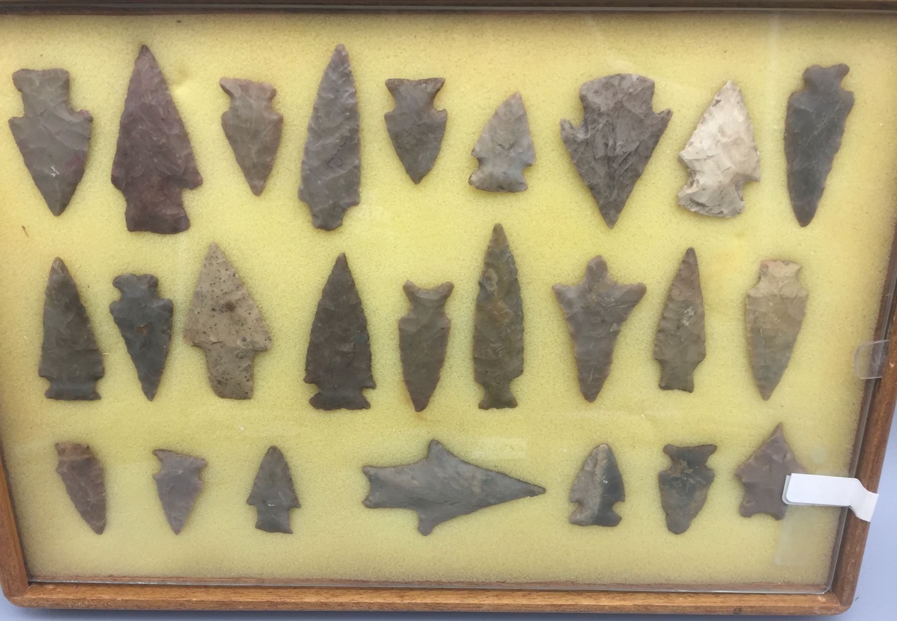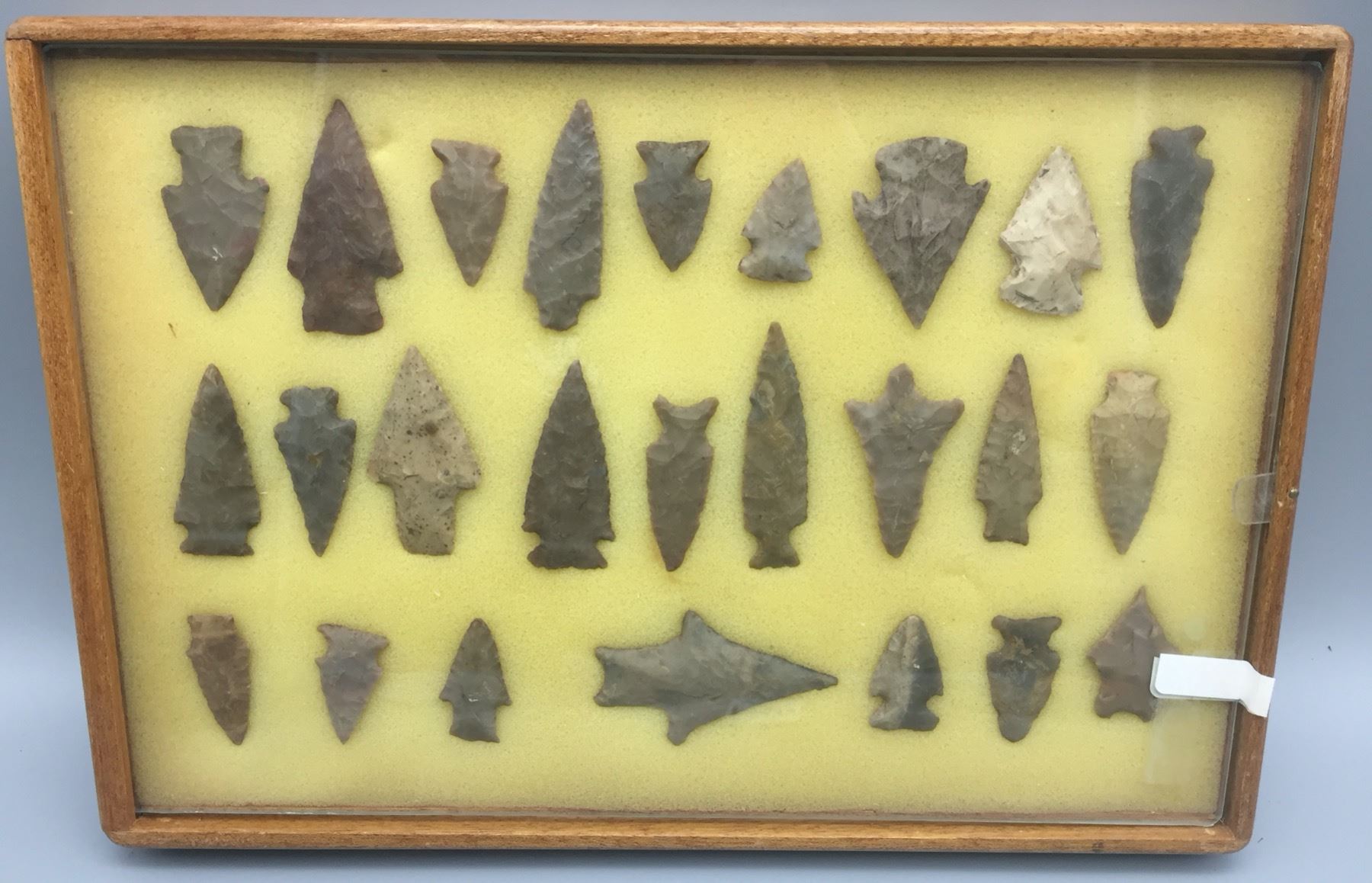 Description: For sale in this lot is a shadowbox display frame of prehistoric arrowheads in varying shapes and sizes. Take a look! Maker: Unknown. Approx. Age: Prehistoric. Size: 12-1/2”w x 8-1/2” tall. Condition: As found. Please look closely at the pictures - they are an important part of our description. Shipping: There will be a $8 handling / packaging fee for shipping this lot. The actual cost of postage will be added on top of that.