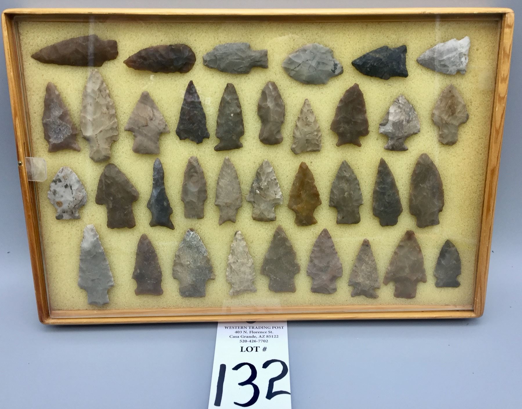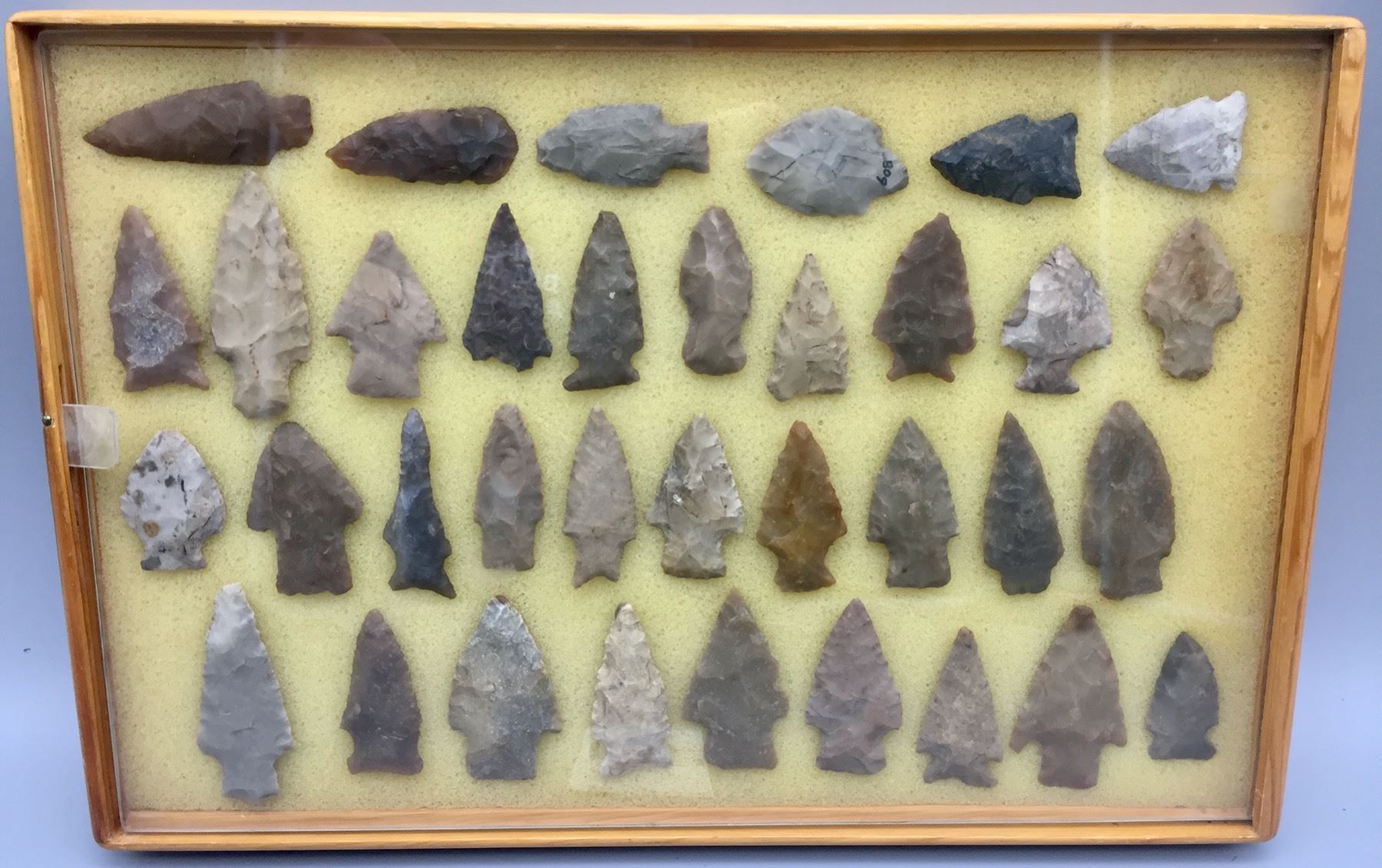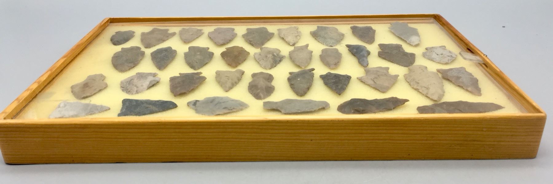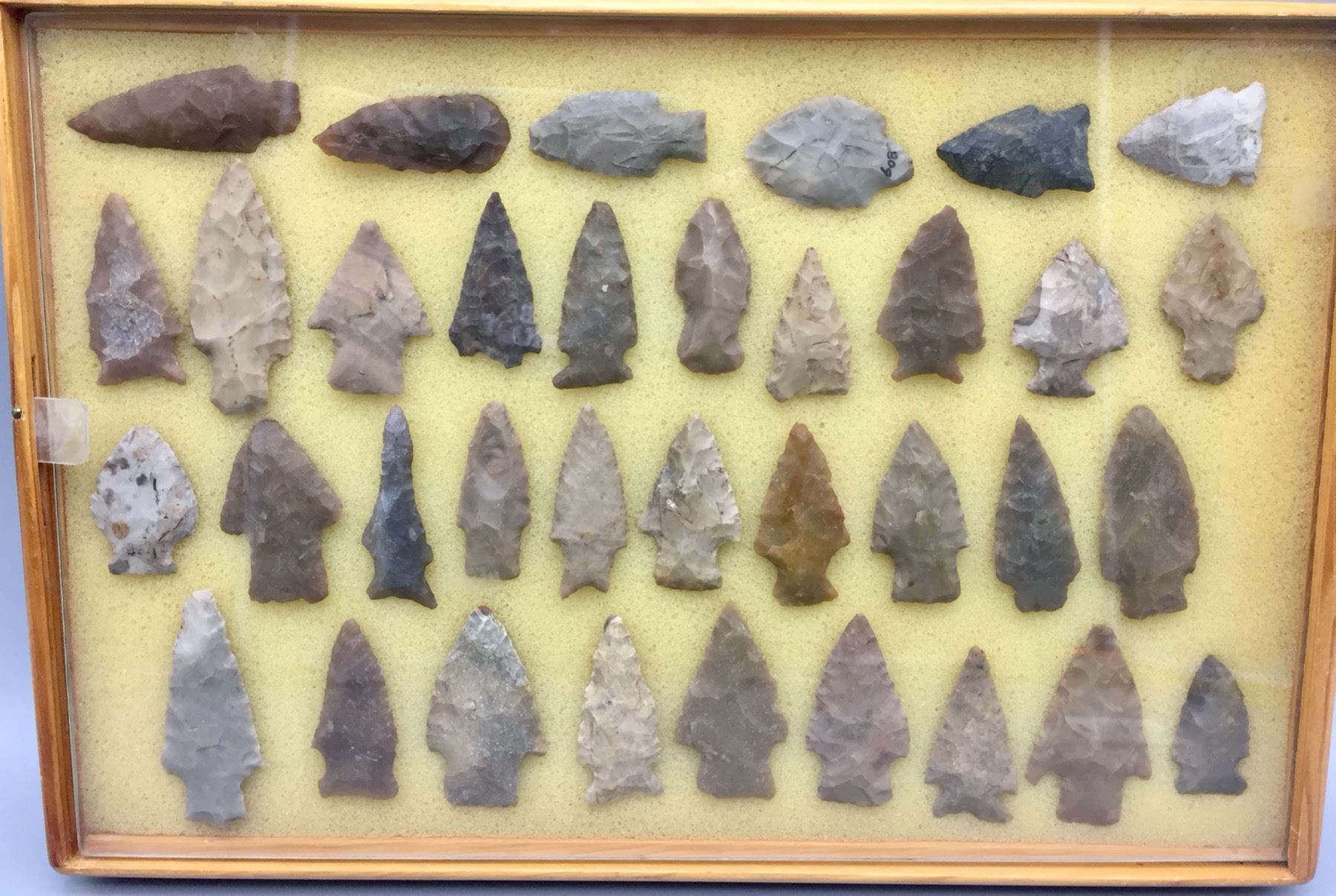 Description: For sale in this lot is a shadowbox display frame of prehistoric arrowheads in varying shapes and sizes. Take a look! Maker: Unknown. Approx. Age: Prehistoric. Size: 12-1/2”w x 8-3/8” tall. Condition: As found. Please look closely at the pictures - they are an important part of our description. Shipping: There will be a $8 handling / packaging fee for shipping this lot. The actual cost of postage will be added on top of that.