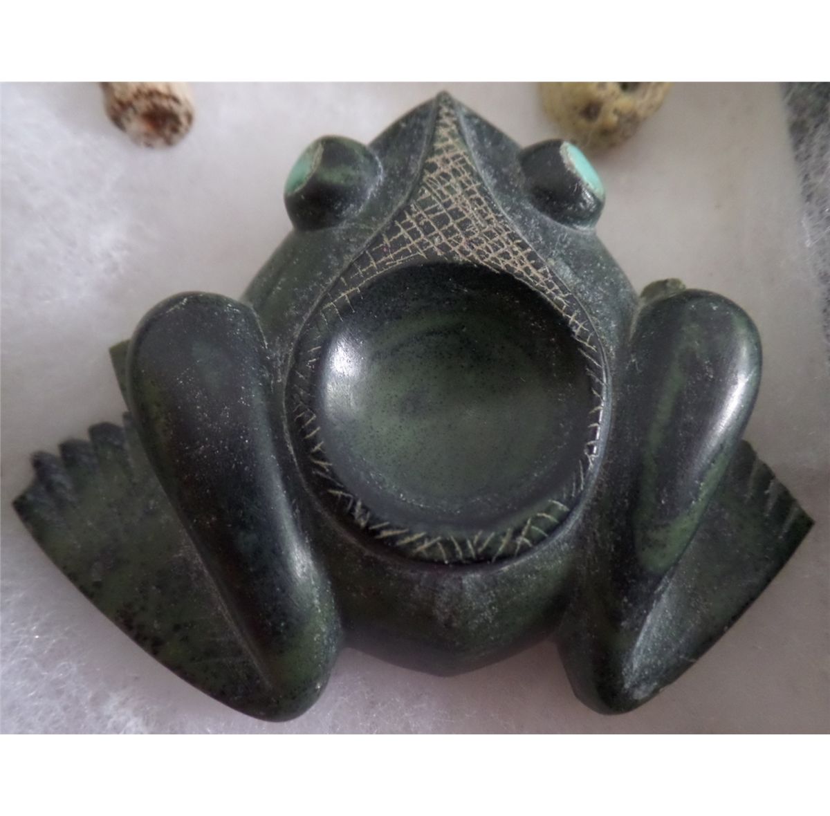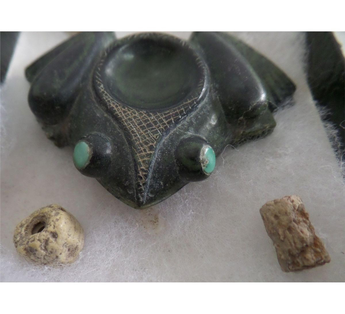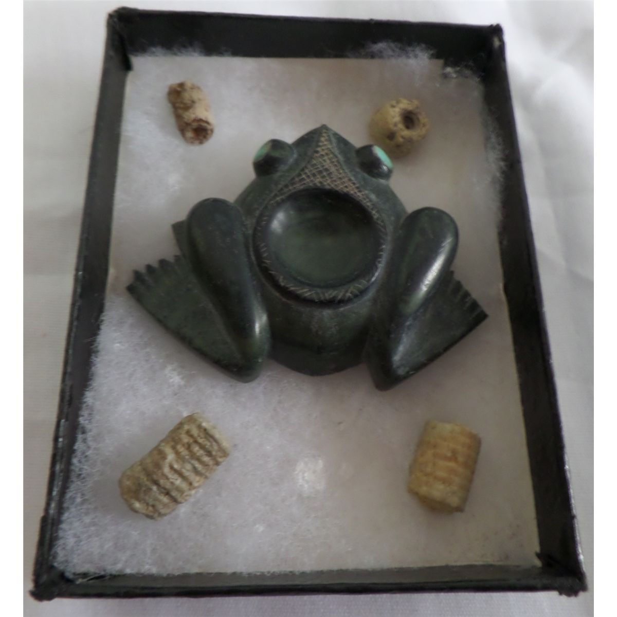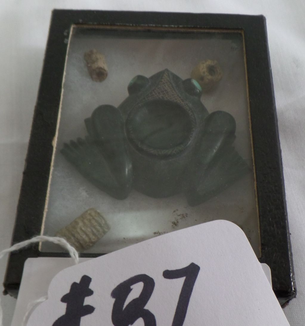 Frame of Stone Frog and 4 Relics from Tucson, Arizona. Item measures 2" x 2". Condition: Front feet missing. Shipping: $12.