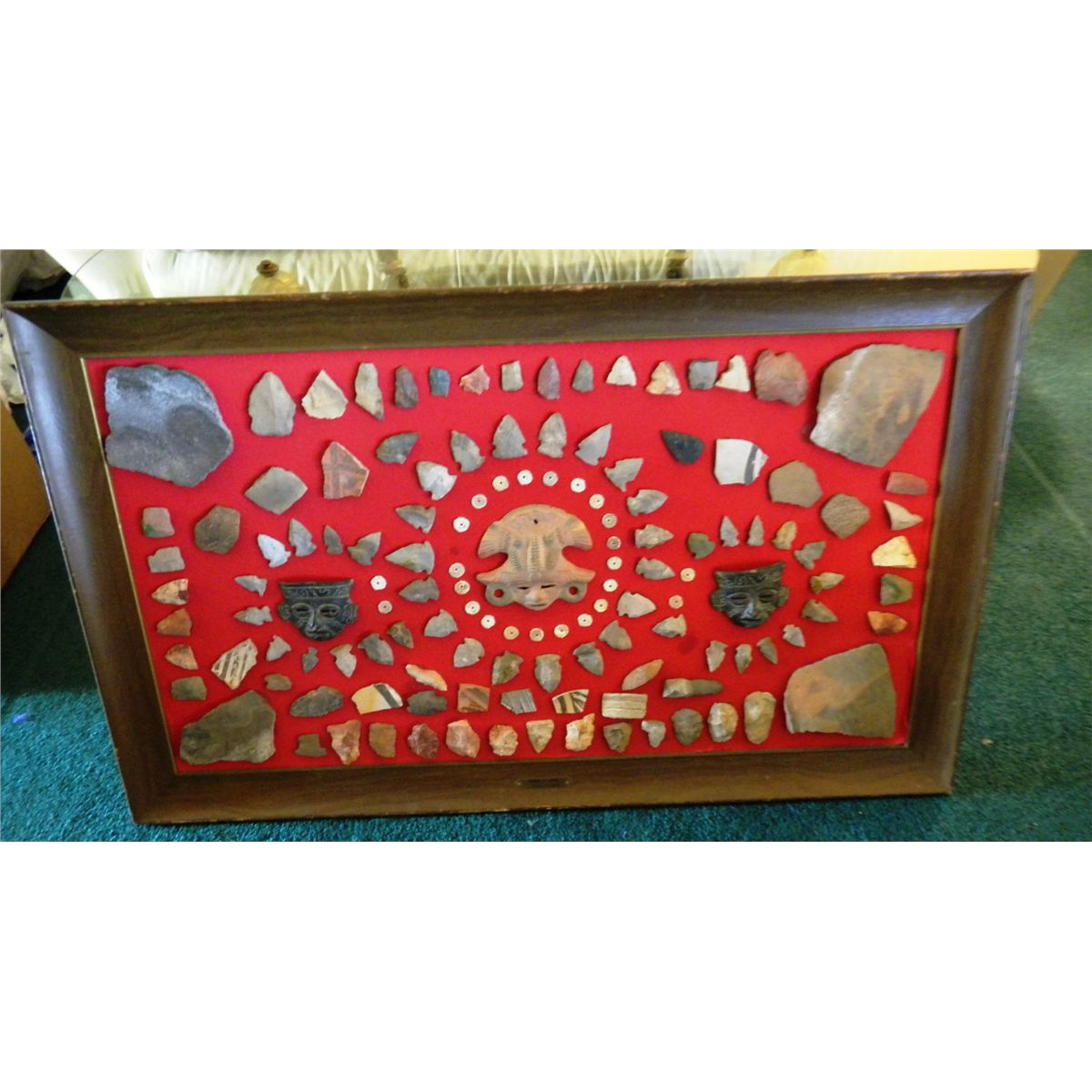 Frame is 40"x 24" - Pre-historic Artifacts, arrowheads, beads and pottery fragments- More than 50 items on the frame. Shipping $60.00 unless items removed from frame