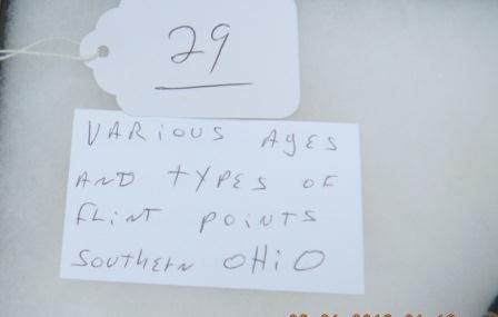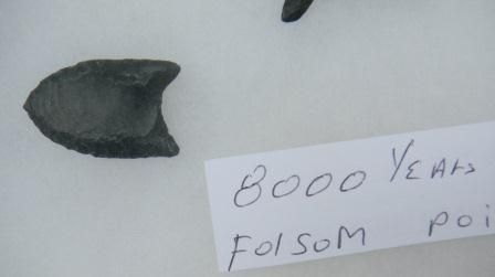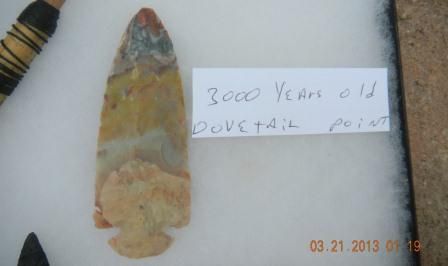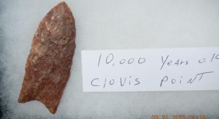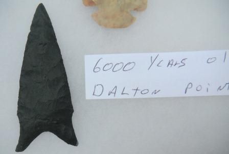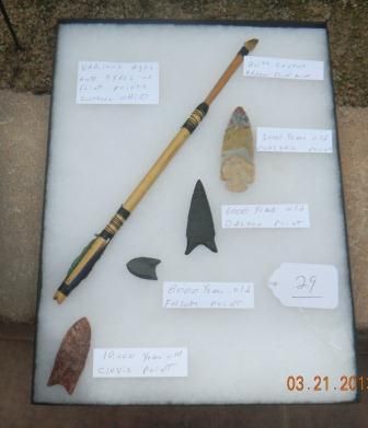 Frame of projectile age progression, Clovis, Folsom, Dalton, Dovetail and arrow shaft, approximately 12 1/2 by 16. Frame included. Fine Condition Shipping $15.00.