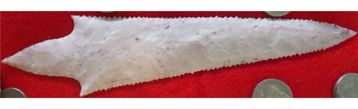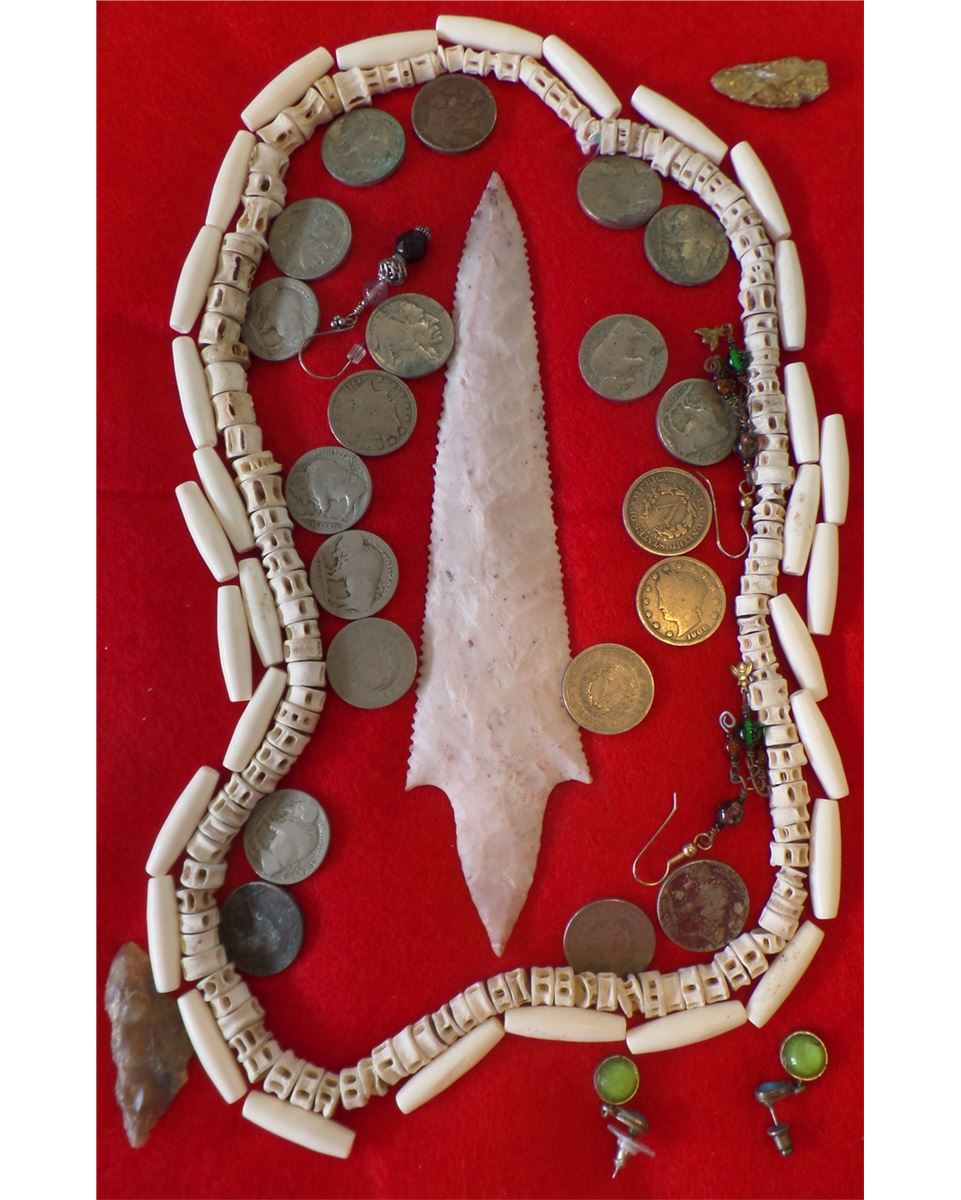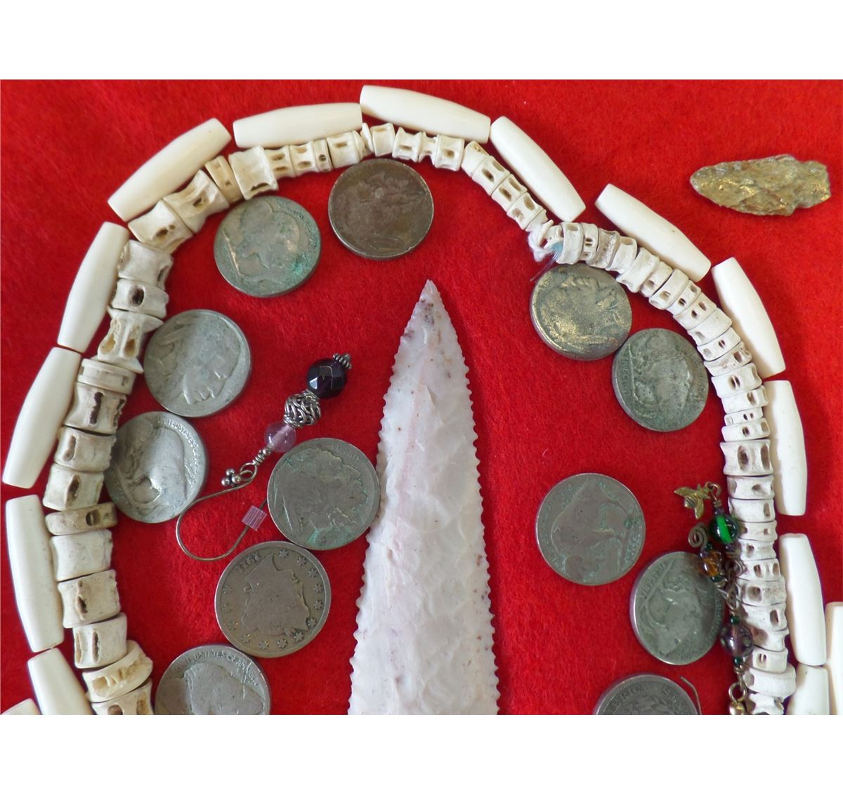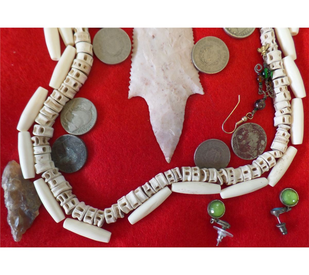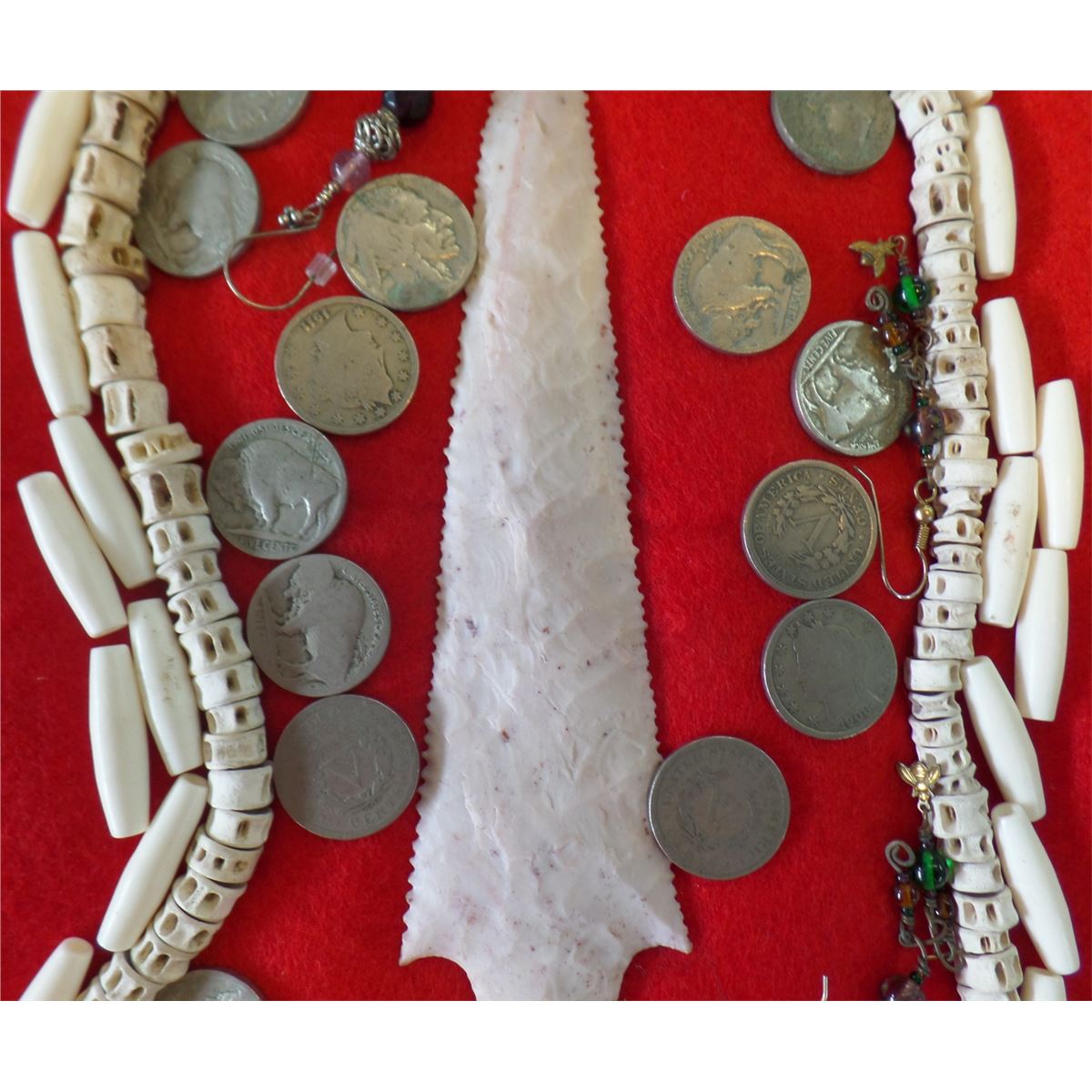 Frame w/ 7 3/8" spear. Historic to Prehistoric period. Made of chert, glass, nickel and bone. Large spear is 7 3/8" x 1 3/4". Caddo, Arkansas. Lot also includes necklaces, old nickels and earrings. Frame not included. Condition: Good, see images. Shipping: $16.