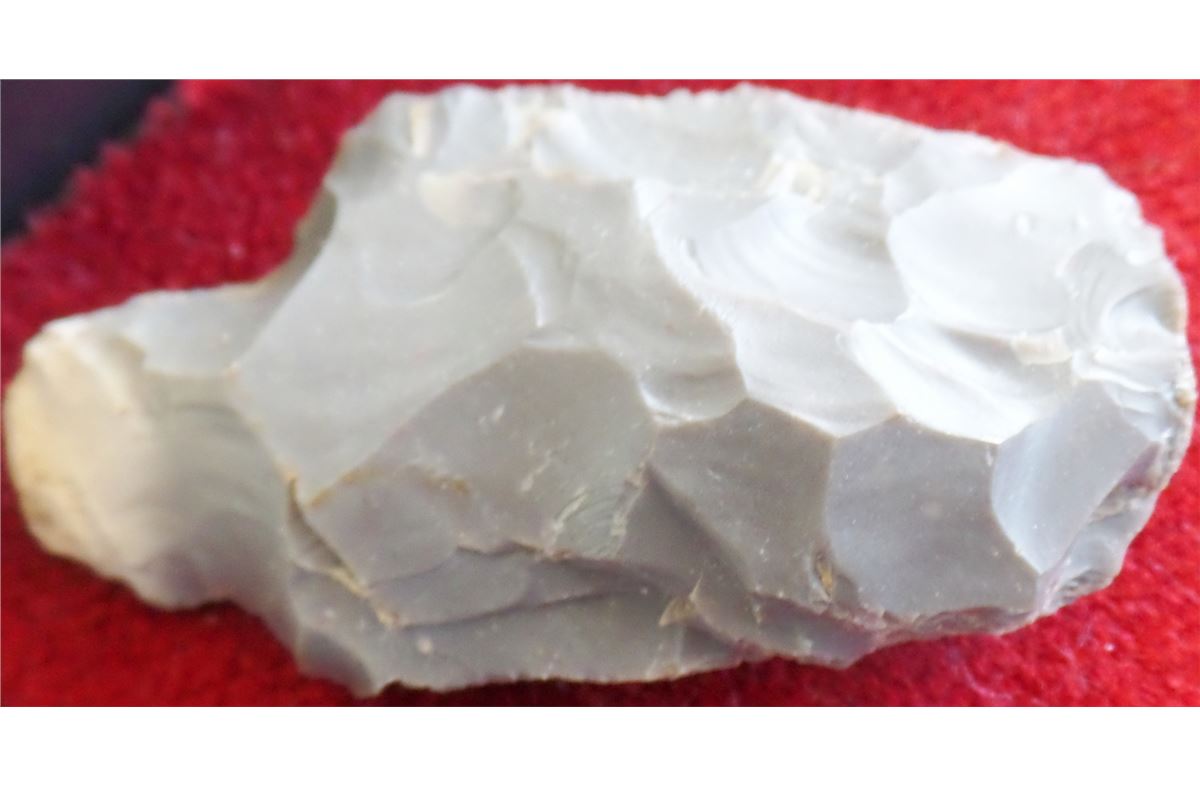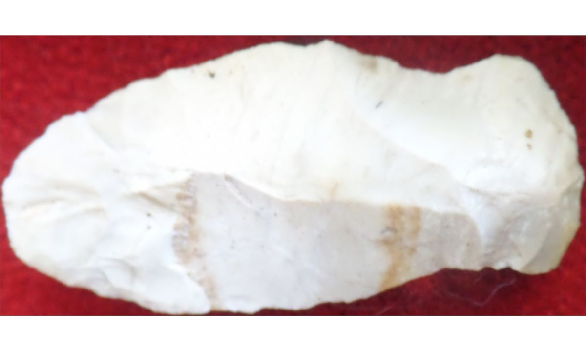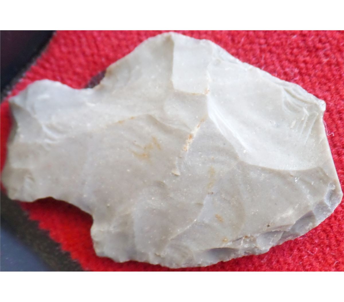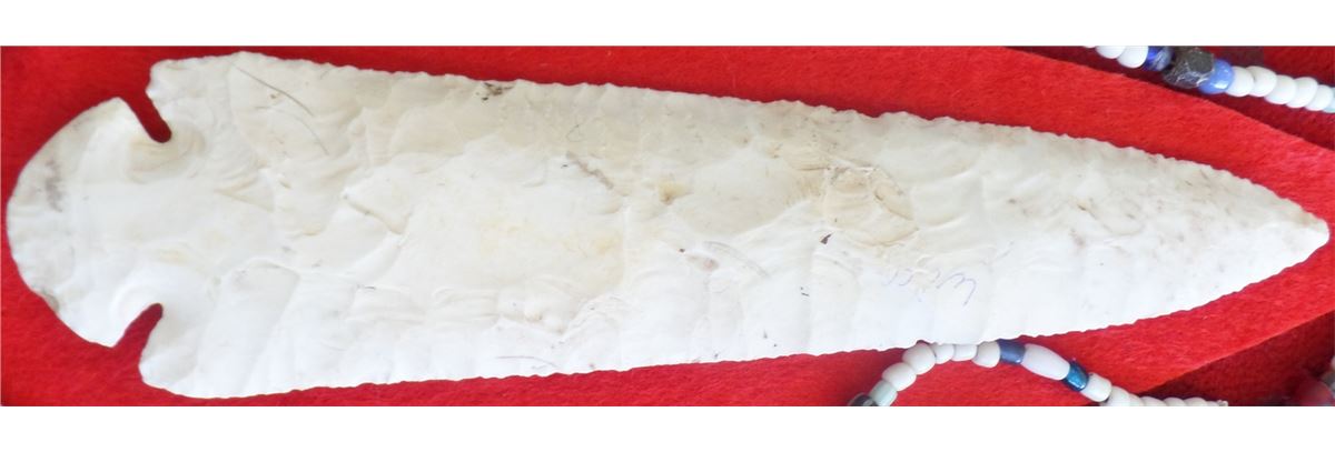 Frame with 6 1/2" Dovetail point. Approx. 2500 years old. Made of Burlington Chert. It's approx. 6 1/2 " x 2" from Will Co. Illinois. Nice long Dovetail with other flint artifacts and clan beads. Condition: Nice condition. Shipping: $20.00.