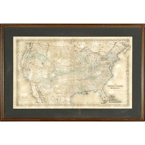 <B> 1855 Map of the United States .</B></I> Colored lithograph, 27.25" x 16.5", showing the the young nation's railroads, towns and principal roads shortly before the Civil War. Published by J.E. Coulton, New York, 1855. Moderate browning, overall light stains. Worn central fold indicates that this item was likely removed from a folio. Good condition. Framed to an overall size of 33.25" x 22.5". <BR><BR><B>Important notice:<