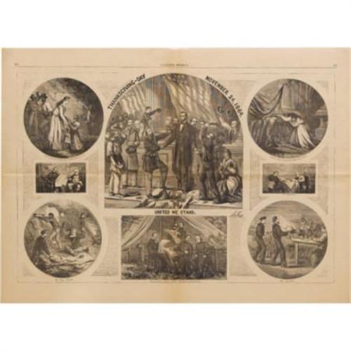 <B>Framed 1864 <I>Harper's Weekly</B></I></B></I> <B>Thomas Nast Engraving.</B></I> Measures 22.75" x 16.5", framed to an overall size of 23" x 17". In the frame is actually the entire Thanksgiving Day issue of <I>Harper's Weekly</B></I> from Saturday, December 3, 1864. It is opened to the centerfold, which is a beautiful Thomas Nast engraving. Just five short months before Lee's surrender at Appomattox Courthouse in April, 1865, this handsome engraving appeared in the most widely-read periodical of the day. It shows a highly optimistic series of eight small engravings relating to the current Union experience in the Civil War. The feeling of the engraving is that a Union victory is imminent, and that President Lincoln is literally at the center of it all. The centerpiece of this centerfold shows Lincoln in the middle of a celebratory crowd, shaking the hand of a Union soldier as they both stand on the Confederate flag. How prescient this piece turned out to be! The magazine is in fine condition, with one small indention to the right side of the frame. A truly remarkable display piece.<BR><BR><b>Shipping:</b> Miscellaneous Collectibles, Smal (<a target="_blank" href="http://www.heritageauctions.com/common/shipping.php">view shipping information</a>)