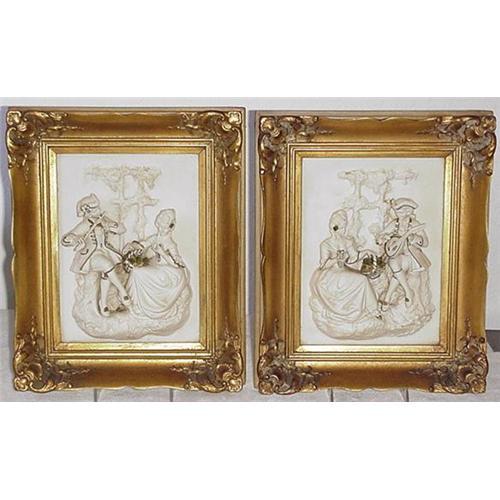 A pair of framed procelain relief pictures,13 1/2" X 11". Gold leaf frames highlight the white porcelain high relief figures seated in 18th century dress, the men playing instruments and the women tending they're flowers. Condition is good they are dirty and should be taken out of the frames an given a good bath. Both have fingers missing and otherwise look intact. They are very pretty and decorative. Made in Germany by Sandizell.