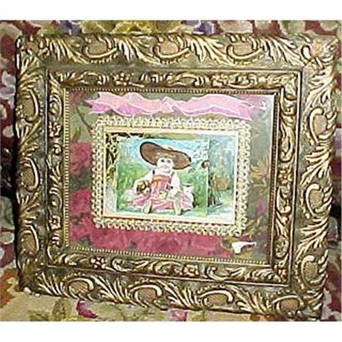 It is framed in a vintage gold Jesso frame with one bad corner. The mat is vintage material and the trim is gold bullion and French ribbon. This is a charming decorative accessory.