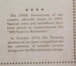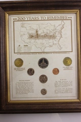 Framed 200 Years to Remember Coin Set Includes BU BiCentennial Half and Washington Quarter and the Roosevelt Dime, Jefferson nickel and Lincoln Penny from 1976. Includes a Great Seal of the United States and Liberty Bell Token