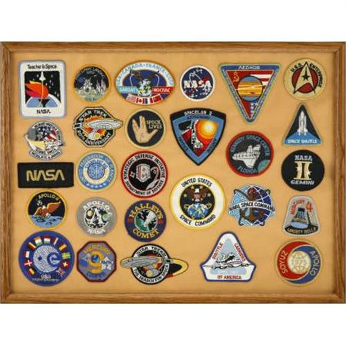 <B>Framed Display of 27 NASA and Space Exploration Souvenir Patches.</B></I> Framed to an overall size of 25" x 19", and beautifully displayed under glass on orange cloth. The idea of unique mission patches was introduced by Gordon Cooper and, since Gemini 5, there has been a unique patch designed for each and every U.S. space mission. More than a few mission-specific insignia are represented here, including Mercury 4, Mercury 9, one Gemini patch, three Apollo mission patches, and two patches representing Christa McAuliffe and the doomed 10th Challenger mission. The collection also includes various agency patches as well, including NASA, the European Space Agency, United States Space Command, Shuttle Carriers of America, Naval Space Command, the Department of Defense's Strategic Defense Initiative, and the Kennedy Space Center. Interestingly, there are five souvenir <I>Star Trek</B></I>-related patches mixed in as well. A wonderful display piece for any space fan.<BR><BR><b>Shipping:</b> Framed - with Glass, Medium (<a target="_blank" href="http://www.heritageauctions.com/common/shipping.php">view shipping information</a>)