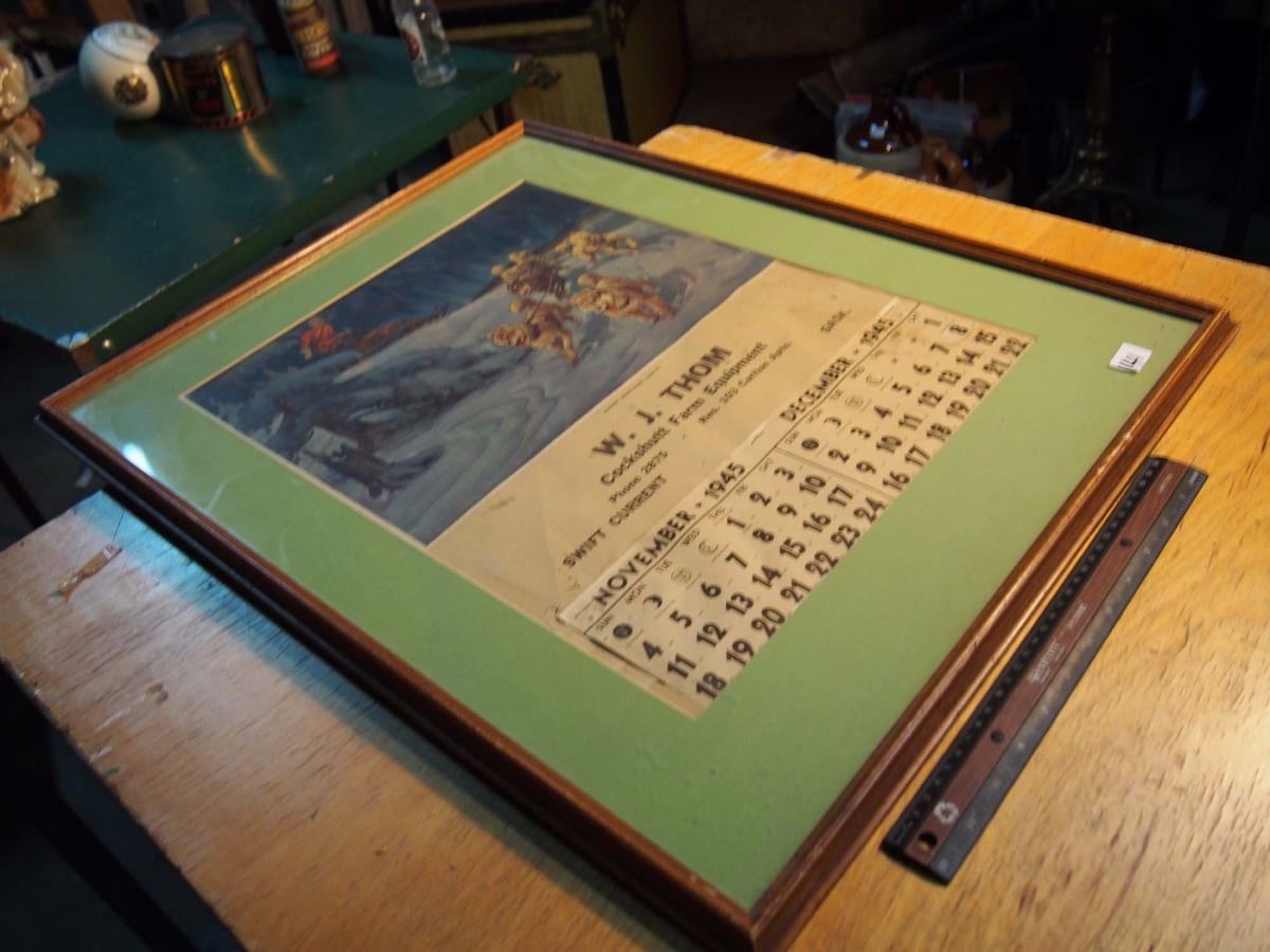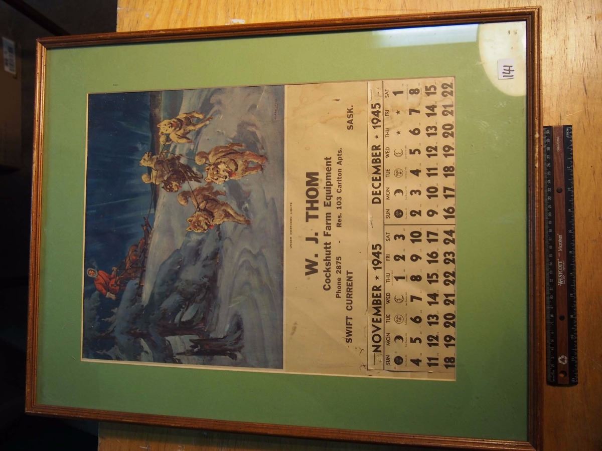 Framed Advertising Calendar (1945 WJ Thom, Cockshut farm equipment, Swift Current Saskatchewan, 22” x 28”)