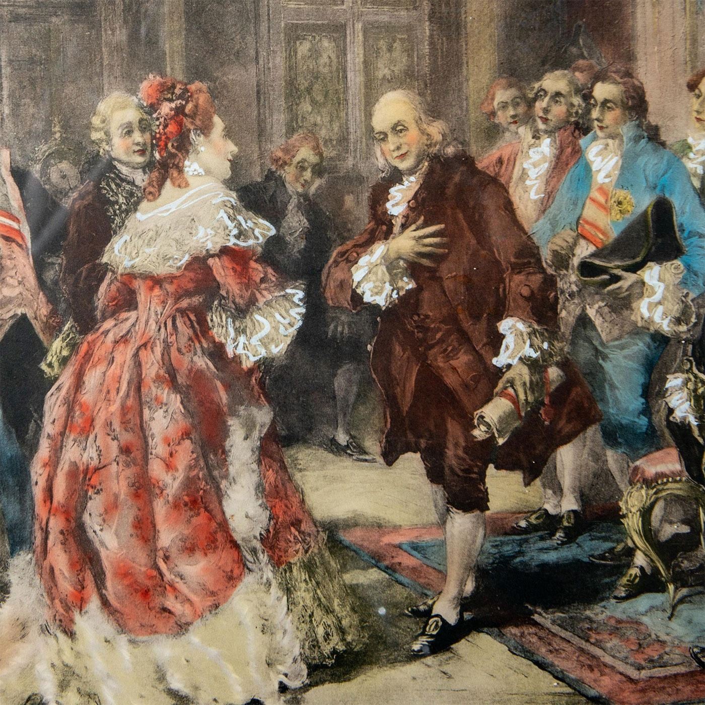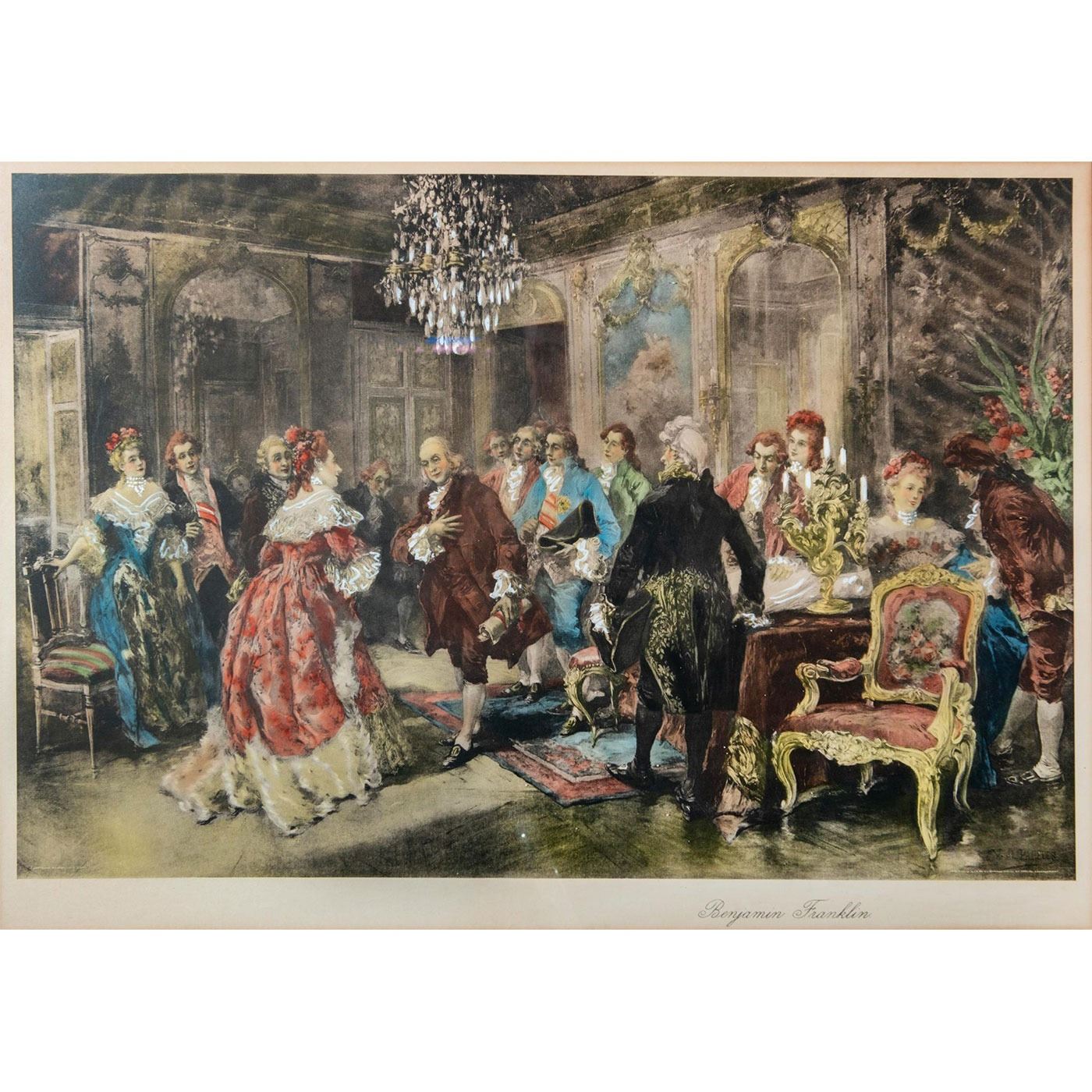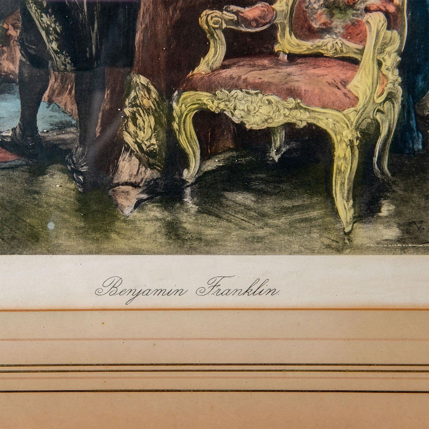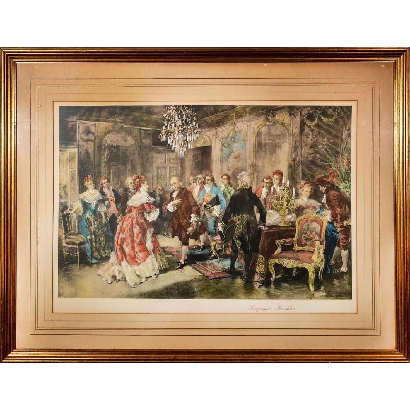 Benjamin Franklin The United States US Ambassador At The Court Of France, originally painted in 1904 by Vicente De Paredes (Spain 1845-1903),this is a 20th century reproduction. Colored lithograph encased in a gilded wooden frame. Signature and title, lower margin. Size sight: 22"H x 31"W. Frame 31.75"H x 41.25"W.