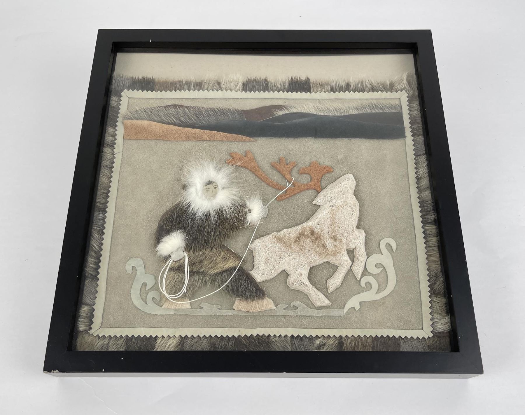 Very neat piece. All made from leather and fur. 12" by 12" framed.
