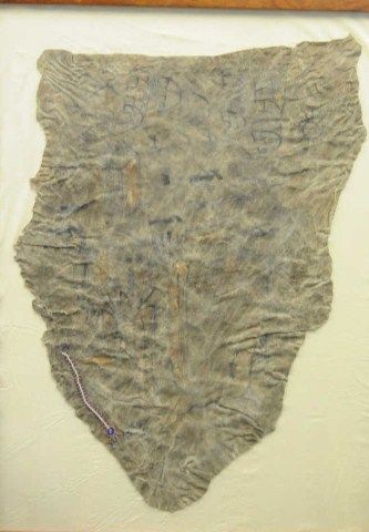 Framed American Indian hide painting approx. 18” x 27” overall with frame size approx. 25” x 33”. This hide painting shows an early trading post scene with images including American soldiers identified by officers’hats, trappers identified by hats, canoes-one empty and one with Indian standing in it and nearby turtle swimming, teepees, Indian long houses, barrel, cooking pot, Indians holding rifles, which appear to be flintlocks. There is also a beaded centipede on the lower right which may be an identifying mark for a tribal clan or individual; in overall good condition with some aging, fading and wear; a beautiful piece that is nicely displayed;accompanied by a copy of a 1988 letter from Larry Wendt to Little John’s when we were in the Town & Country shopping center in Orange, CA stating in part that this piece was museum mounted on acid free medium and wasconsigned to Mr. Wendt by the Wheelwright Museum of Santa Fe, NM and according to then Director of the Museum, Edson Way, the piece was originally painted between 1860 and 1875 with the beaded centipede being opined to