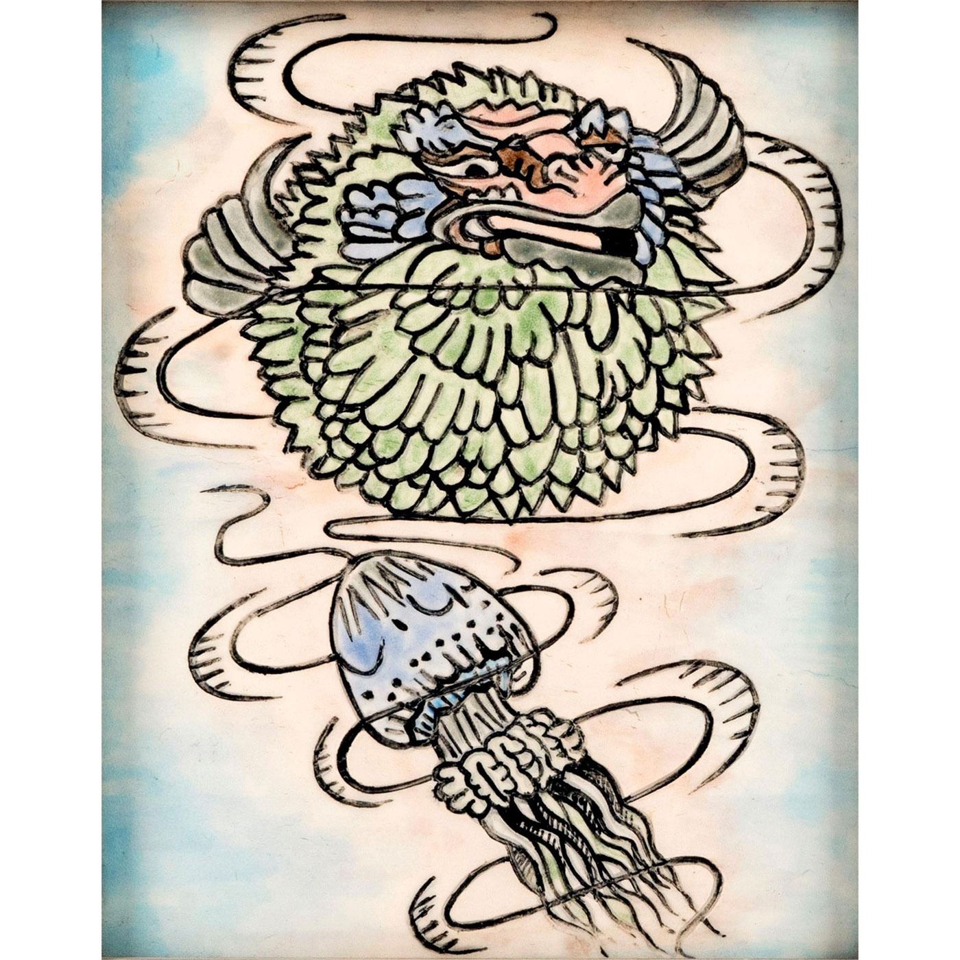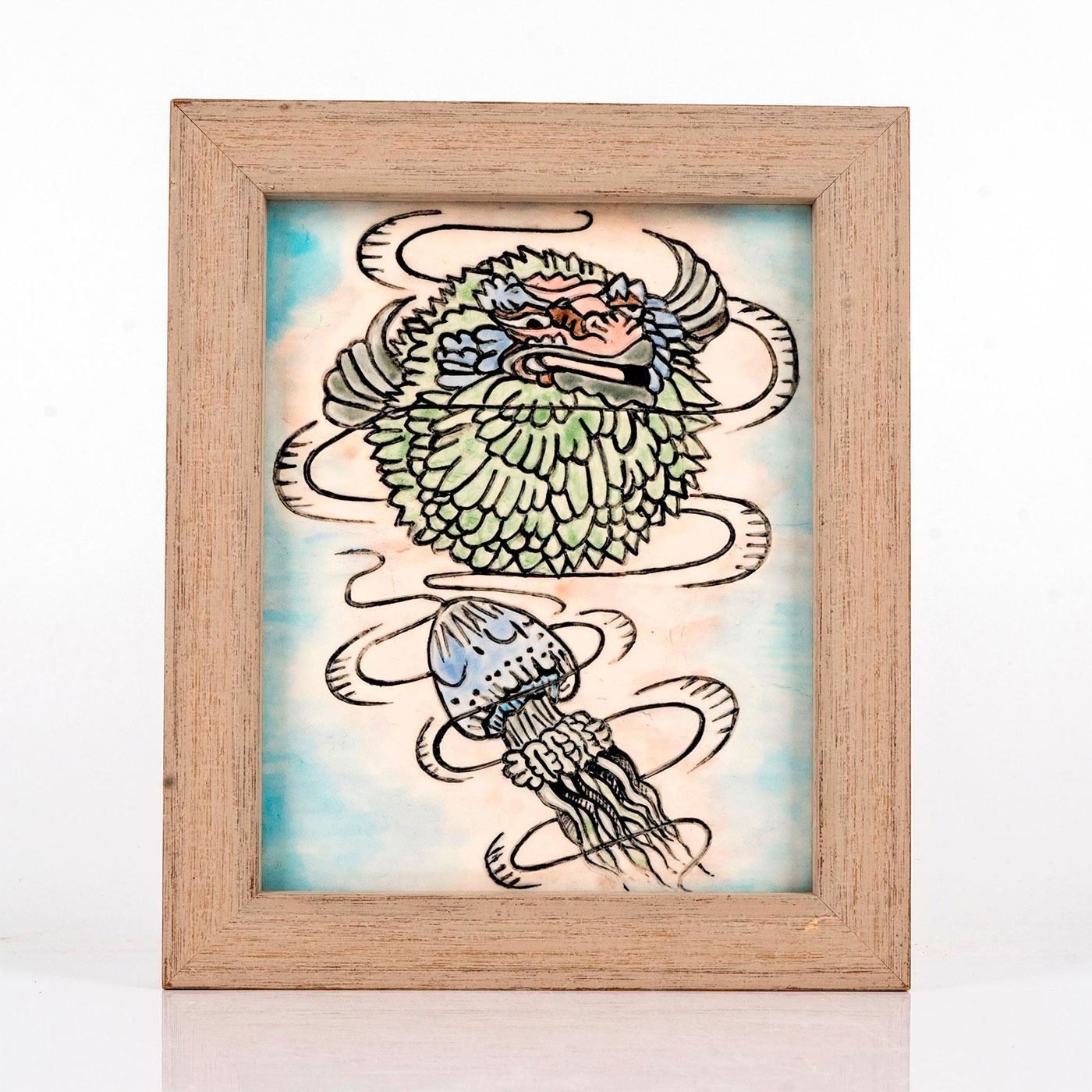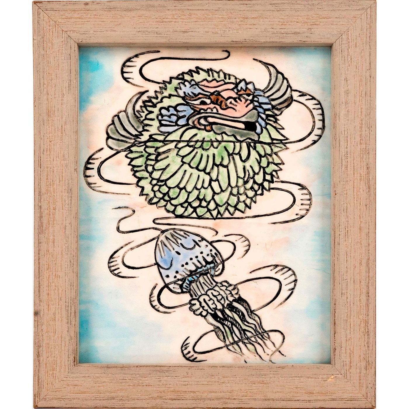 Earthenware trial for vase; featuring marine life scene of a puffer fish and jelly fish. Artist signed and dated 2018. Encased in a wooden frame.