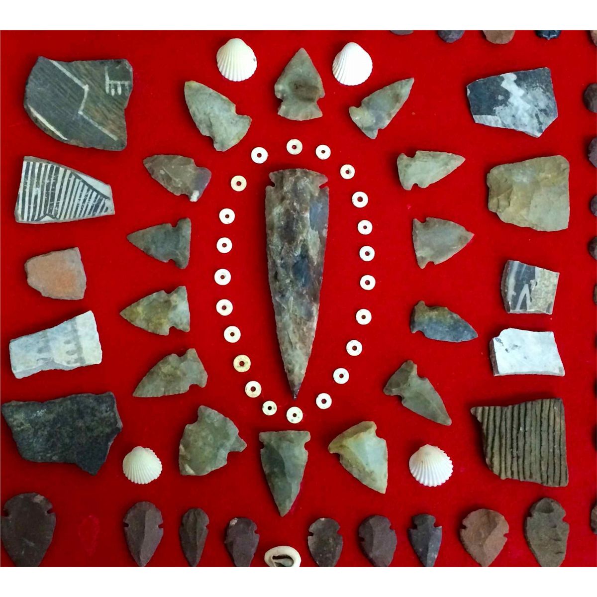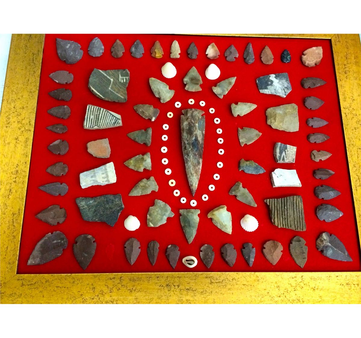 55 individual arrowheads and 10 pottery shards and other shell beads all framed in a beautiful collage. There is a space where one arrowhead is missing. A simple fix, as they are just glued onto the red felt material.