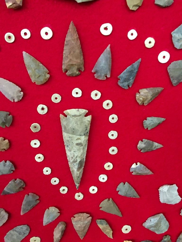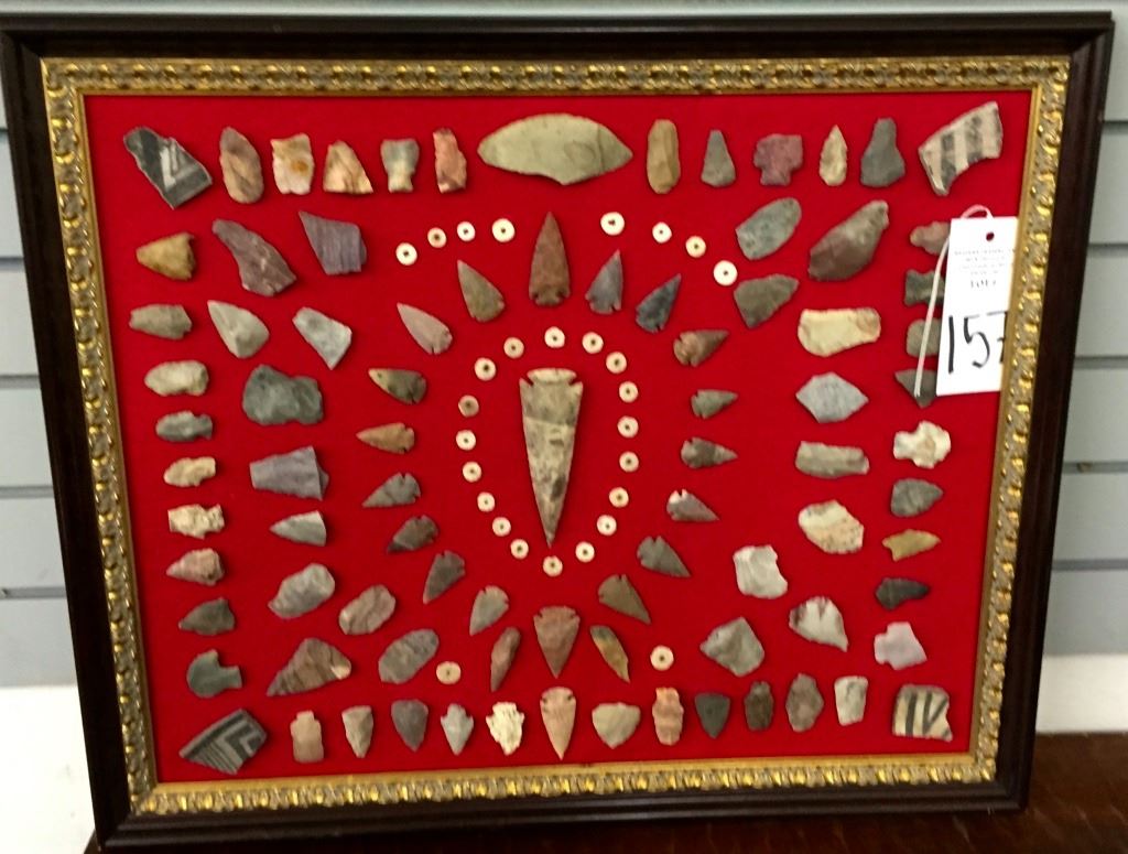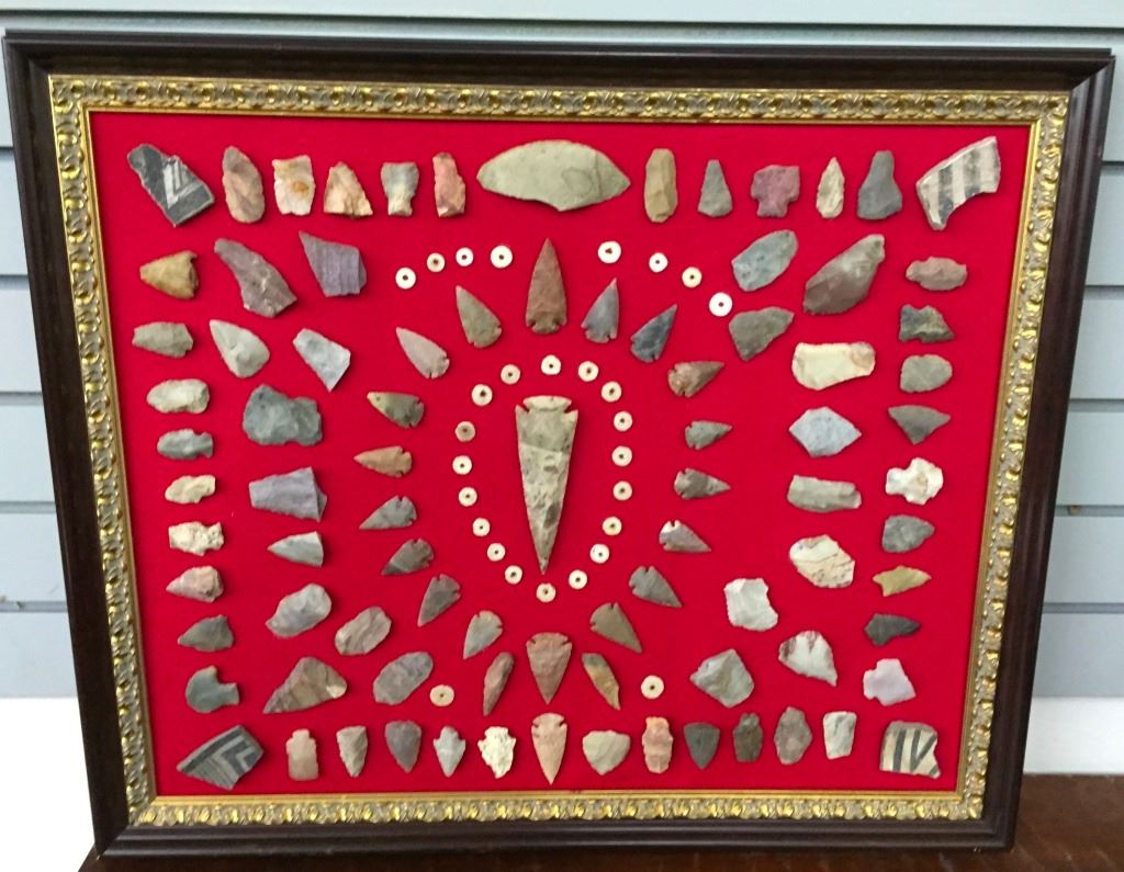 This framed arrowhead collage measures 25" x 21" including the frame. There are also numerous pottery shards, scrapers, trade beads etc. included in this artwork. Please look closely at the pics as they are an important part of our description. Shipping: There will be a $10 handling / packaging fee for shipping this lot. The actual cost of postage will be added on top of that.