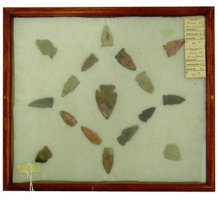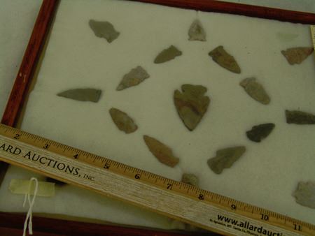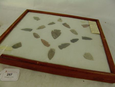 Various Ages, Collection of 17 various sizes and types of mostly modern arrowheads in a nice wood frame. Very good condition. 11" x 13"