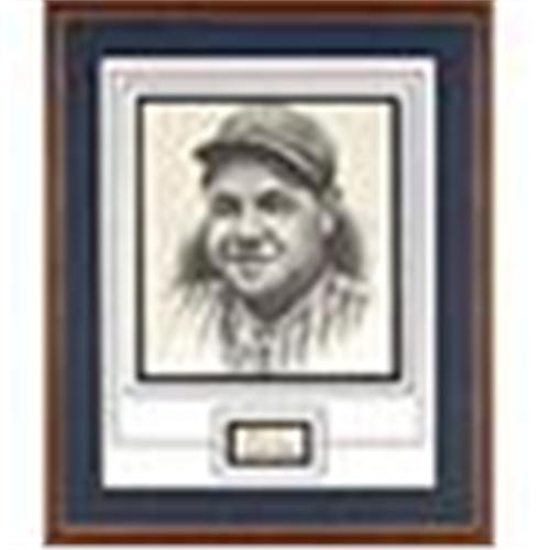 20" x 24" framed display with a large print of a hand-drawn Babe Ruth bust, appears to be on parchment. Matted with a 1-1/2" x 3" cut signed and inscribed in black fountain pen by Babe Ruth, who wrote "From Babe Ruth." Fantastic image appears to fade into the background, with Ruth seeming to visit the observer from another immortal realm. Display appears to be NRMT-MINT, unbelievably bold Ruth signature grades a near 10. Accompanied by a LOA from JSA.