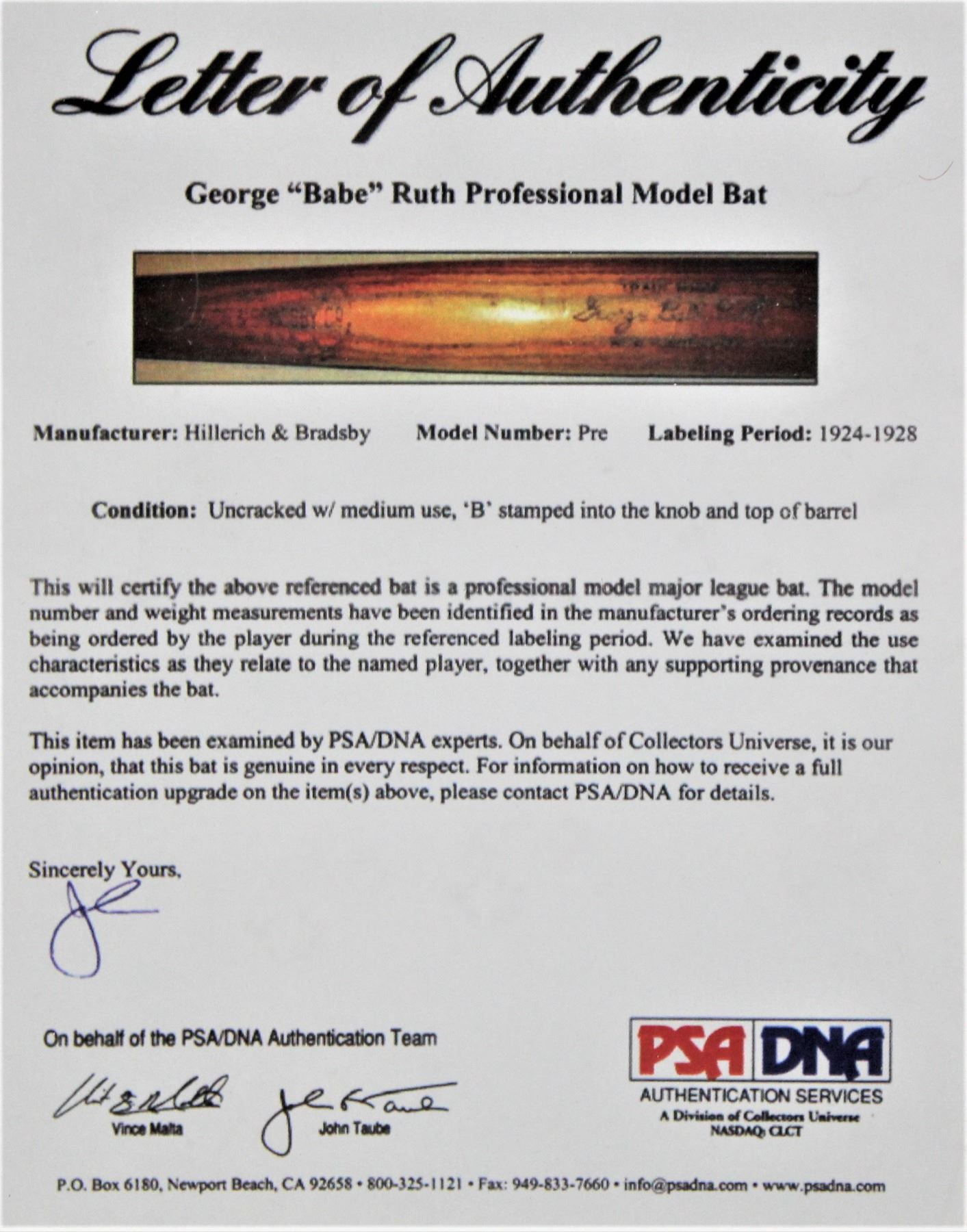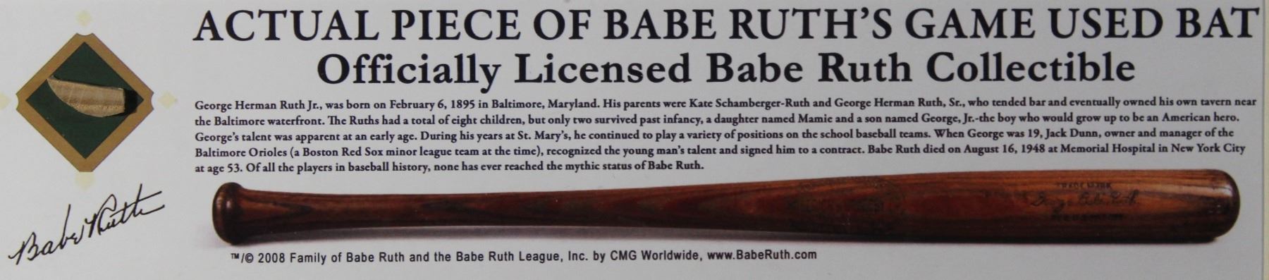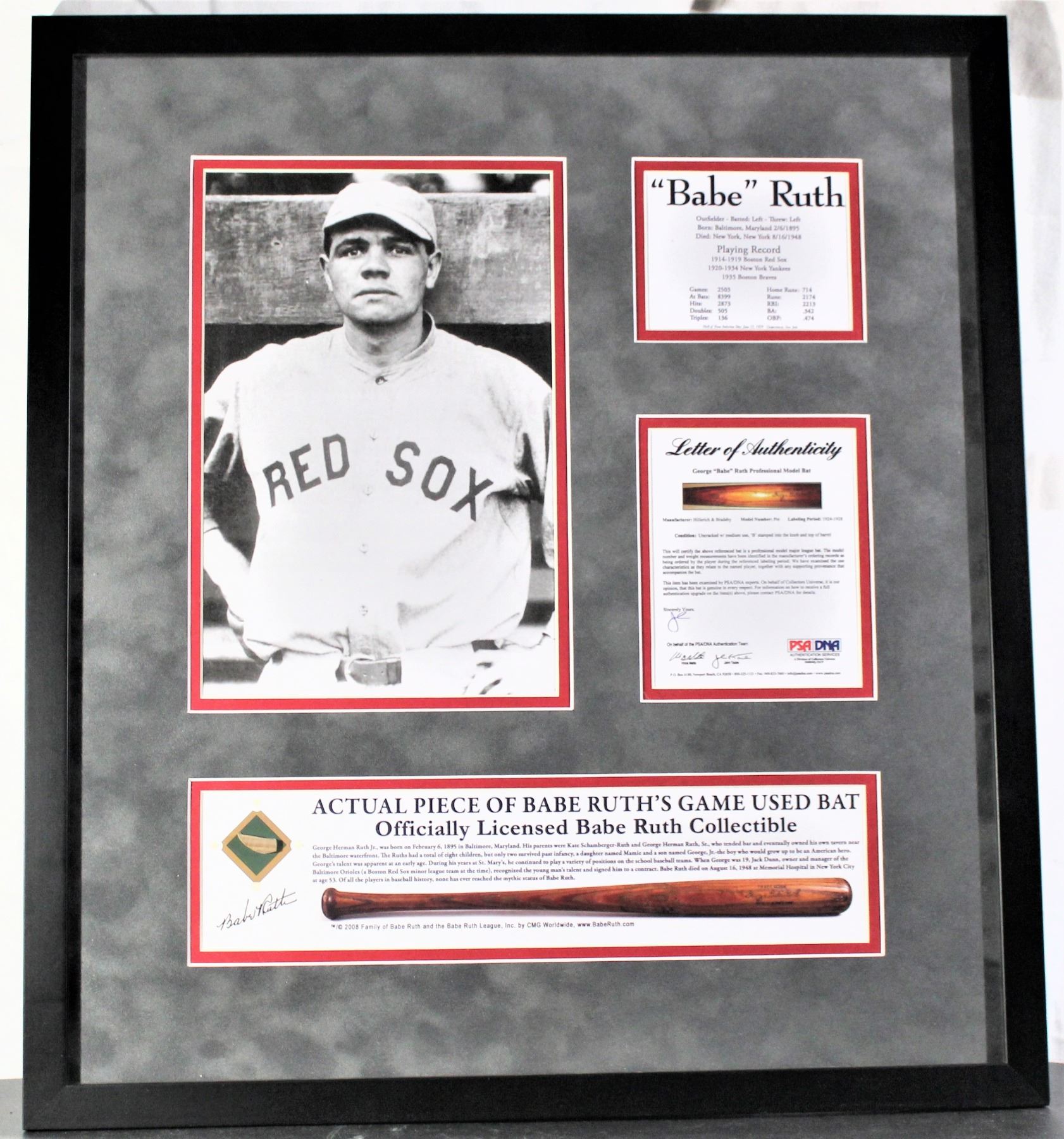 , PSA/DNA Authentication. , Babe Ruth (1895-1948), Actual Cut Piece of Babe Ruth’s game used bat. Matted and framed with an 8” x 10” black and white image of Babe Ruth and his classic swing, with an overall size of 19” x 21”.