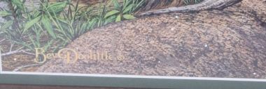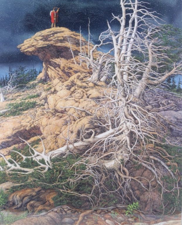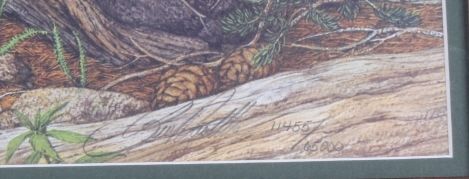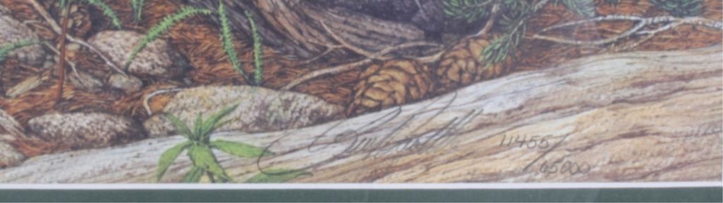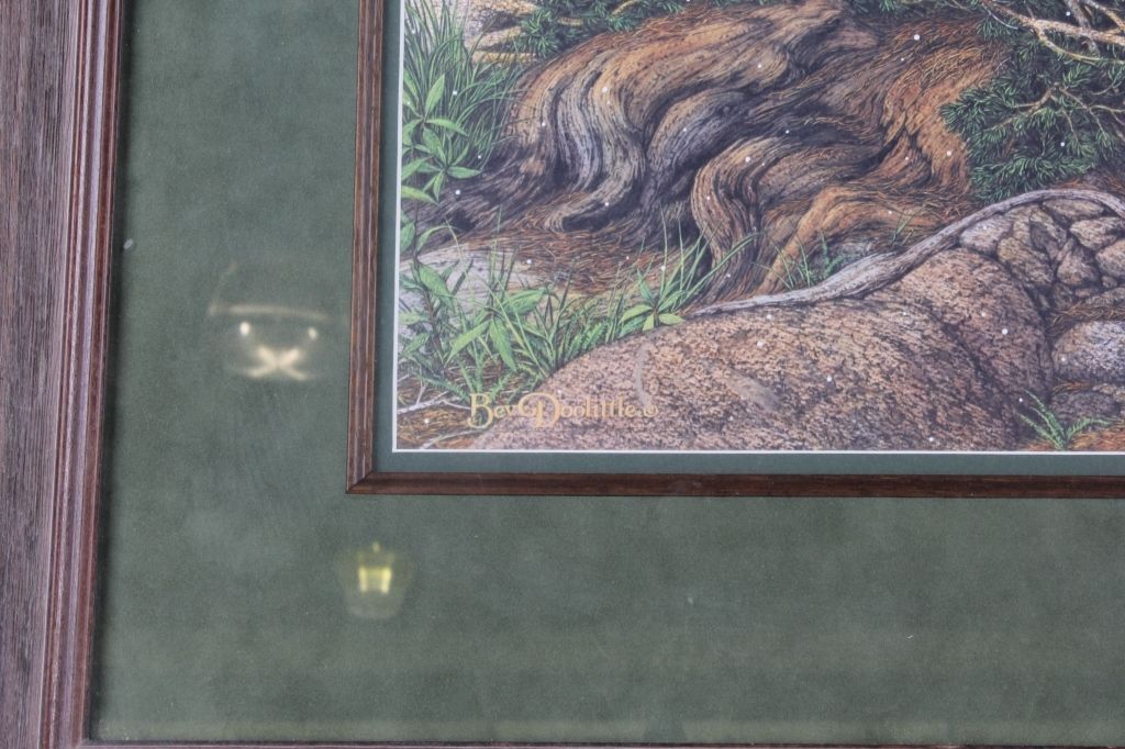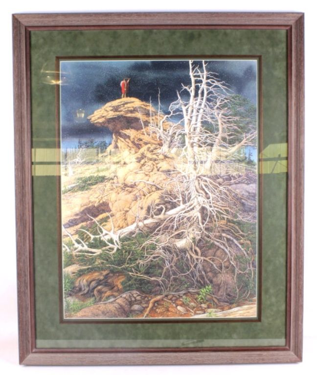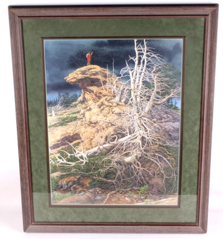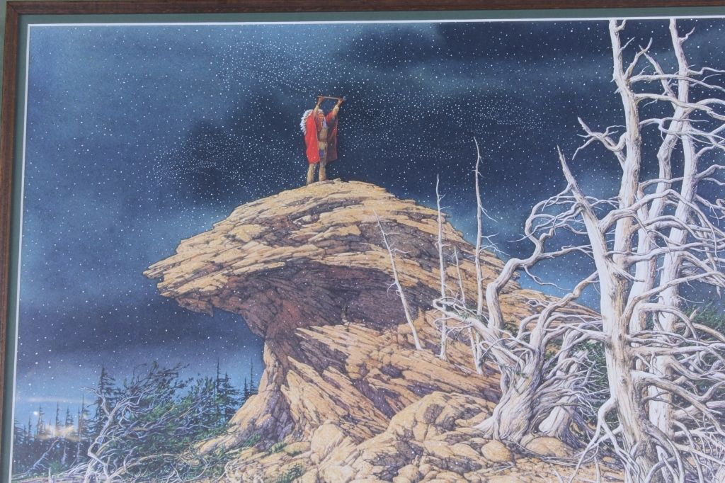 This lot features a Bev Doolittle print. It has been hand signed by the artist and is numbered 11,455/65,000. Known for her subliminal imagery, this print features a Natve American atop a "Bald Eagle" cliff. Theprint measures 21" x 28" and the frame is 30.5" x 38".