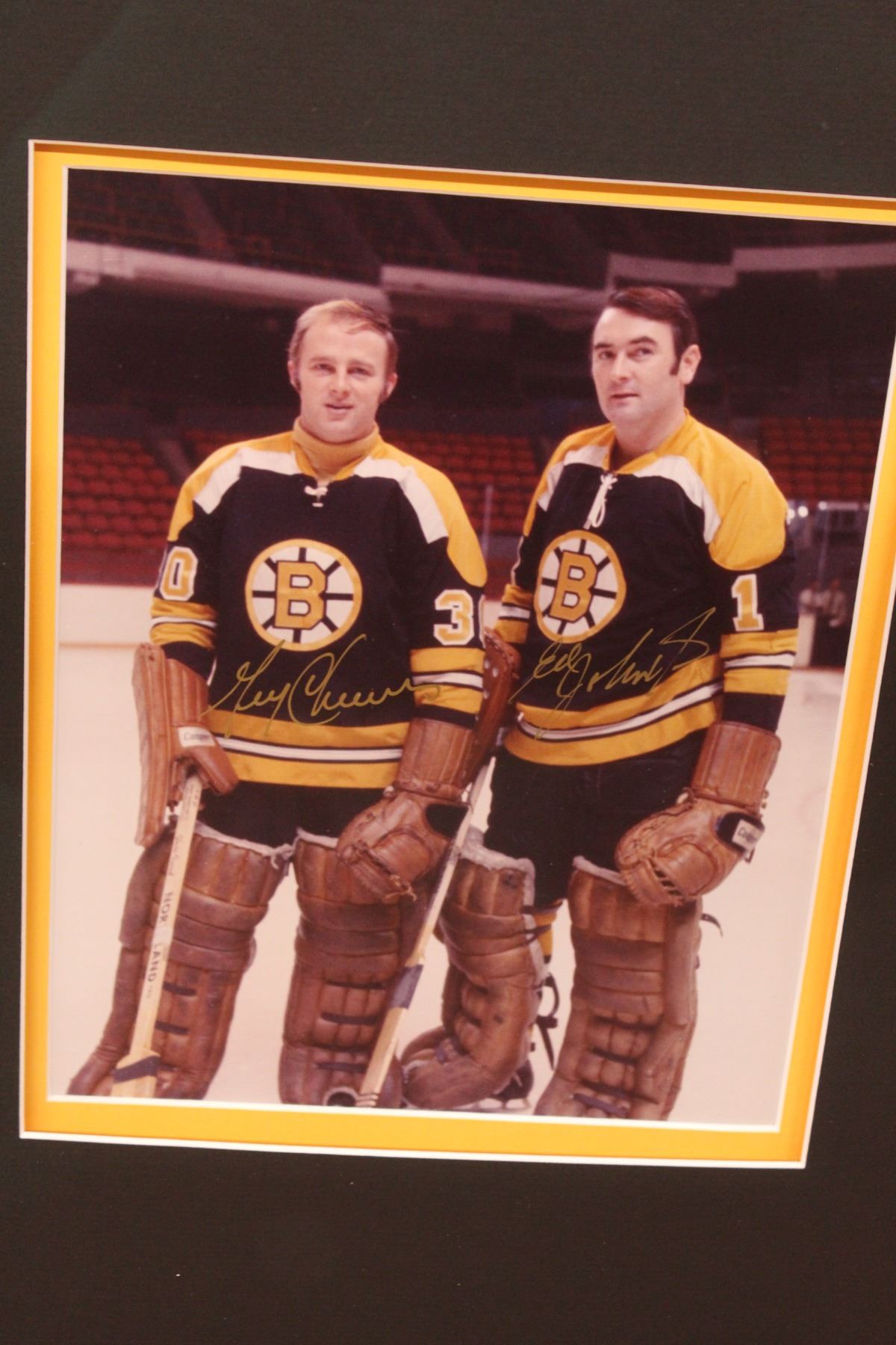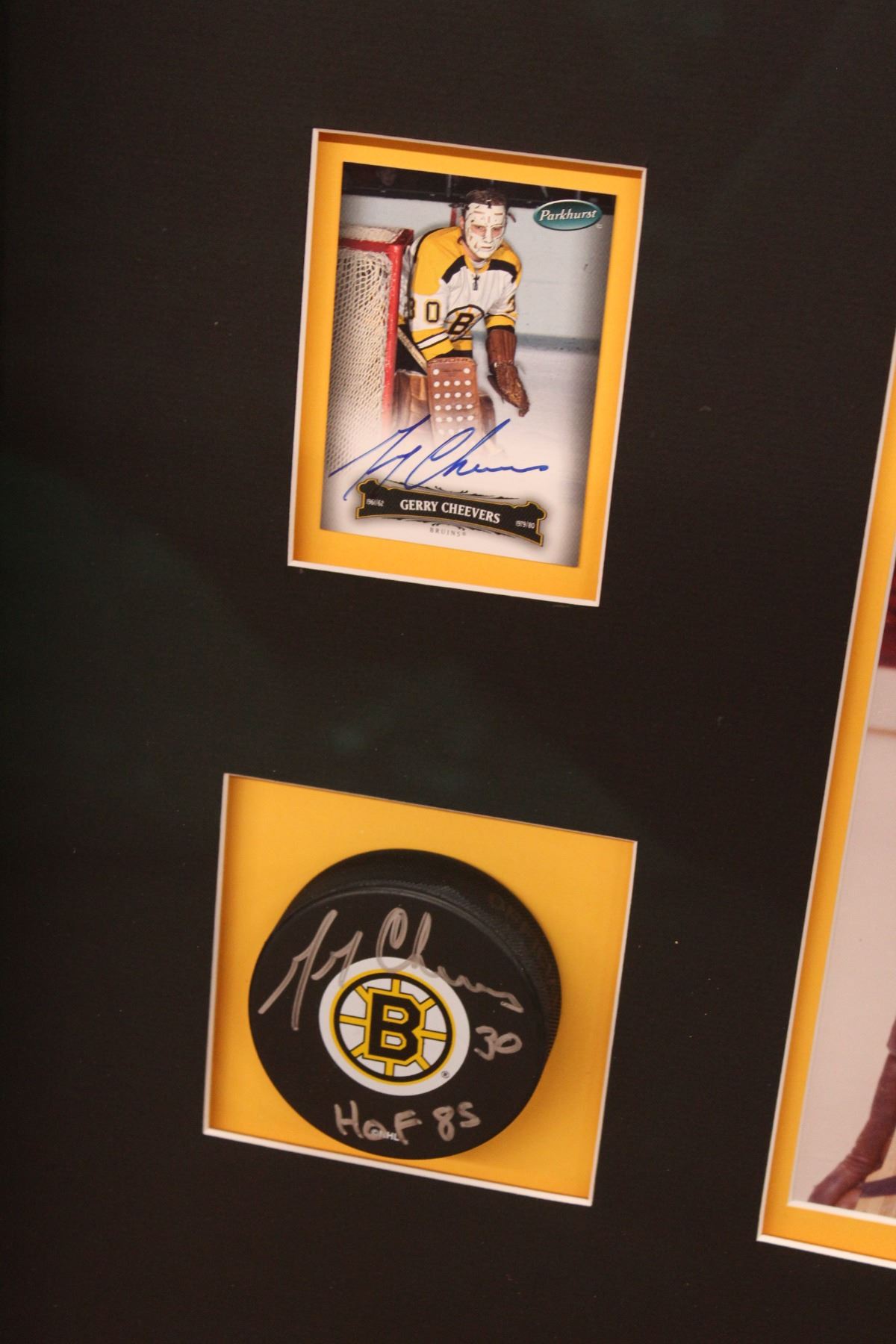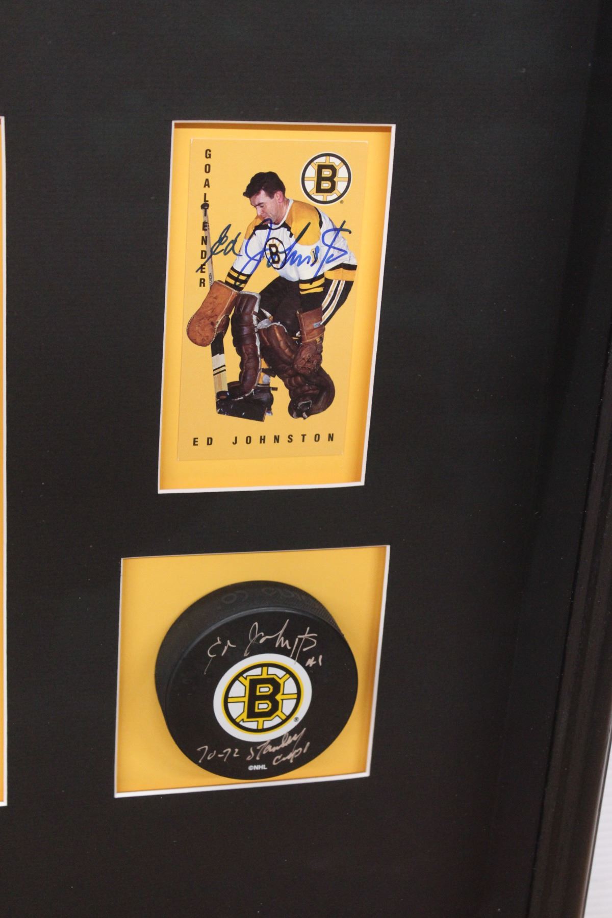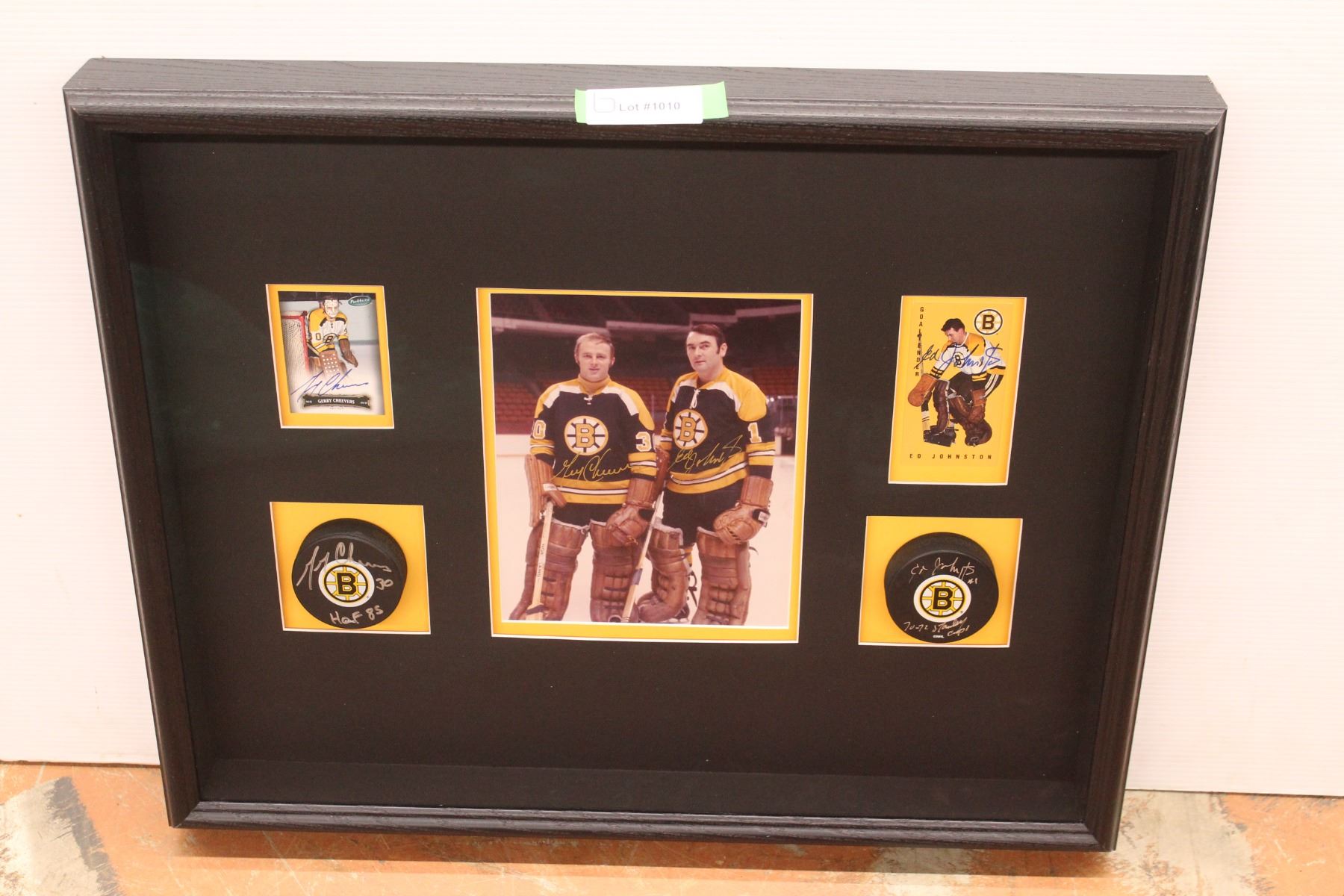 * Framed Boston Bruins Gerry Cheevers and Ed Johnston Signed Picture, Signed Trading Cards, and Signed Pucks - 22" x 26 1/2"