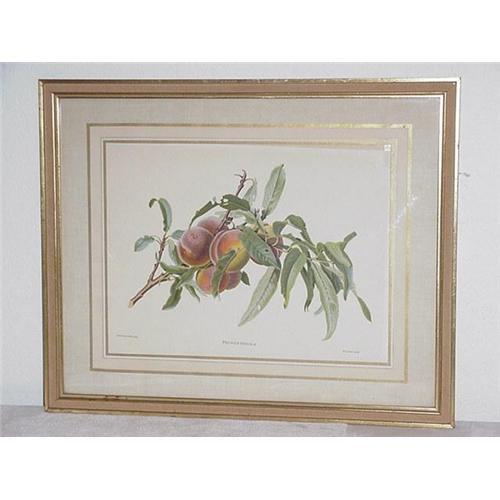 A framed print titled "Prunus Persica", 21 1/2" long, 17 1/2" tall. The subject is a group of ripe peaches on a leaf filled branch. Fancy matt with gold detailing and a very pretty gold frame with fabric panel.(5)