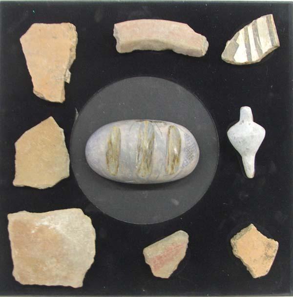 Framed Box Of Artifact Reproductions. Largest piece measures approx. 3 1/2''L x 2''W. Box measures approx. 12'' x 12'' x 2''. Buyers Pay Actual Shipping and Handling Charges(see terms and conditions for more information).