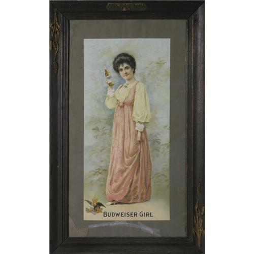 <B> Framed "Budweiser Girl" 1904 Beer Advertisement </B></I> Modern men are not the only ones who love the Bud girls; even a hundred years ago Anheuser Busch used sex appeal to market their product. Though this lovely lady is wearing slightly different attire than modern Bud girls she is no less appealing! The first Budweiser girl was introduced in 1883 and she maintained her looks and attire until 1907. The lithograph featured here is from 1904 and thus pictures the first Budweiser girl! She is holding her typical pose, with one arm raised holding a bottle of beer. After 1907 the Budweiser girl appeared in a long-sleeve red dress and a new hairstyle. The more demure and soft version pictured here was used early on, and she is considered the rarest Bud girl by collectors. This blue-eyed beauty is wearing an Anheuser Busch official emblem on a necklace, as she seductively shows a tiny fraction of her ankle. The Bud girl would no doubt blaze the trail for the bikini-clad Budweiser girls we see at every Super Bowl! A fantastic piece of breweriana! <BR><BR>Condition- The frame (24" x 39.25" overall) is slightly damaged on upper edge, the Anheuser-Busch plaque is chipped and worn. The glass in front of the girl is cracked along the bottom edge. The lithograph itself (13.25" x 27.75") is in excellent shape, though some minor soiling has occurred over the years. With a small amount of cleaning and love this girl could be the centerpiece for any collection!