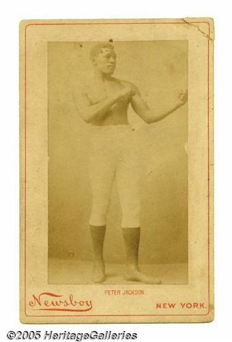 <B>Framed Cabinet Card by Newsboy of the Great Boxer Peter Jackson</B></I> Born in Jamaica, Peter Jackson was arguably the best boxer of the 1880s and 1890s. The champion, John L. Sullivan, refused to fight Jackson, citing his race as the reason. The sad fact was that Sullivan had previously fought an African American man and most likely knew he could not go toe-to-toe with Jackson. In 1891, Jackson fought "Gentleman" Jim Corbett for an astounding 61 rounds, the fight ending in a draw. (This was just one year before Corbett went on to defeat Sullivan.) A wonderful, scarce sports portrait! Lot:250