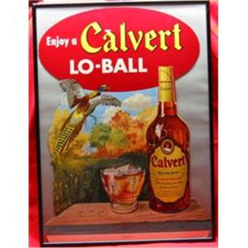 Framed Calvert Reserve Whiskey Hunting Cardboard featuring its specialty drink, "Lo-Ball." The cardboard has never been set up or folded. Great color and graphics of a flying partridge. There is a small tear (abt 1/2") in the cardboard just over the "a" in Calvert. (see pix #2) The frame is black metal and quite heavy. The background is a medium gray. Believe this to be from the 1950s or 1960s. Calvert Whiskey is no longer being produced. (B333)