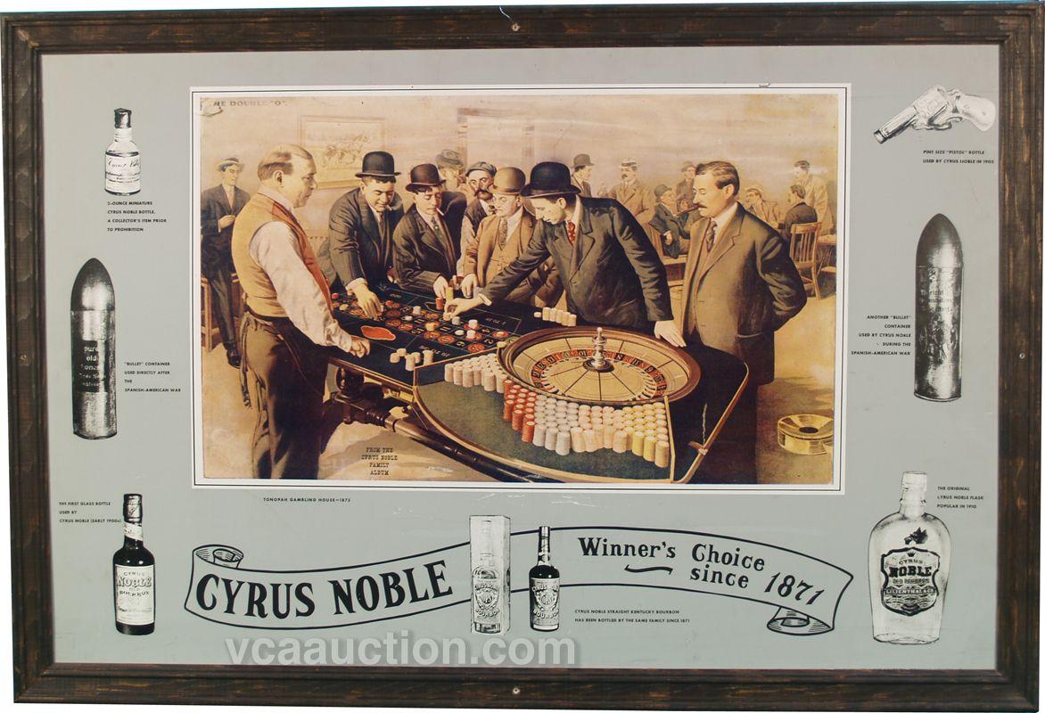 Framed Cardboard Cyrus Noble Advertisement Showing Early Roulette Game & Various Cyrus Noble Products - 42" x 29"