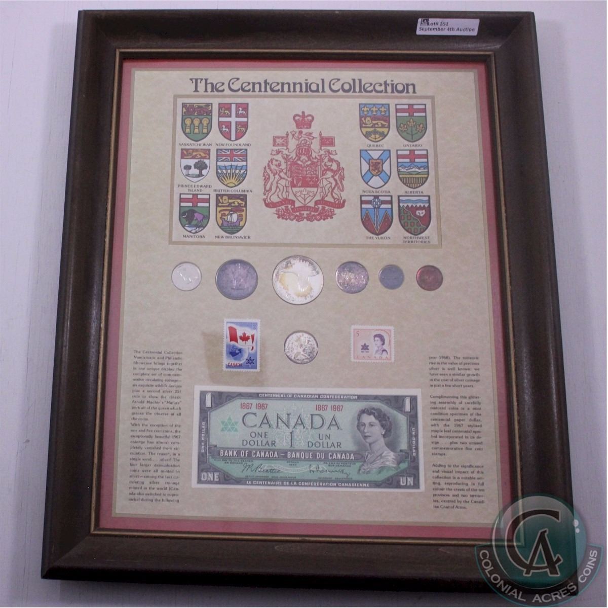 Framed Centennial Collection featuring the 1967 year set as well as a 1967 Specimen $1 and two unused stamps. This framed set includes the following 1967 coins: 1-cent, 5-cent, 10-cent, 2x 25-cent, 50-cent and $1. Coins contain natural toning. Not only are the six wildlife designs represented but also, there is a second 25-cent representing Queen Elizabeth's "Mature" portrait which adores the obverse of each coin. Also encased in this frame, is a 1967 Specimen $1 note and 2x 5-cent stamps. (10 pcs)