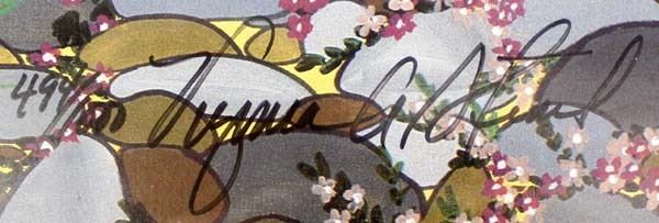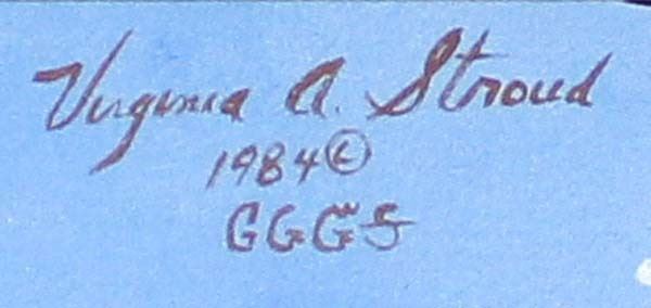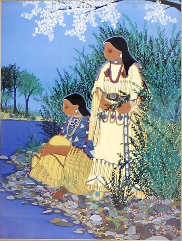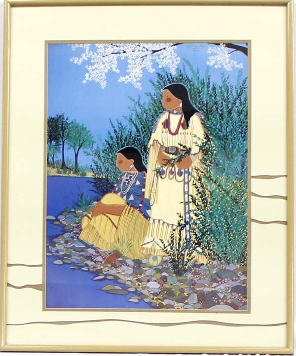 Framed 1984 Cherokee Creek Print by Virginia Stroud (b. 1951), limited edition #494/1000, hand signed by the artist, visual measures 17.5'' x 23.5'', custom mat and under glass, beautiful colors, FYI: ''She sold her first painting by the time she was thirteen. Using a modification of the pictographic style of the 19th Century ledger drawings, Stroud paints to show that the historical Indian culture still survives in contemporary society.''