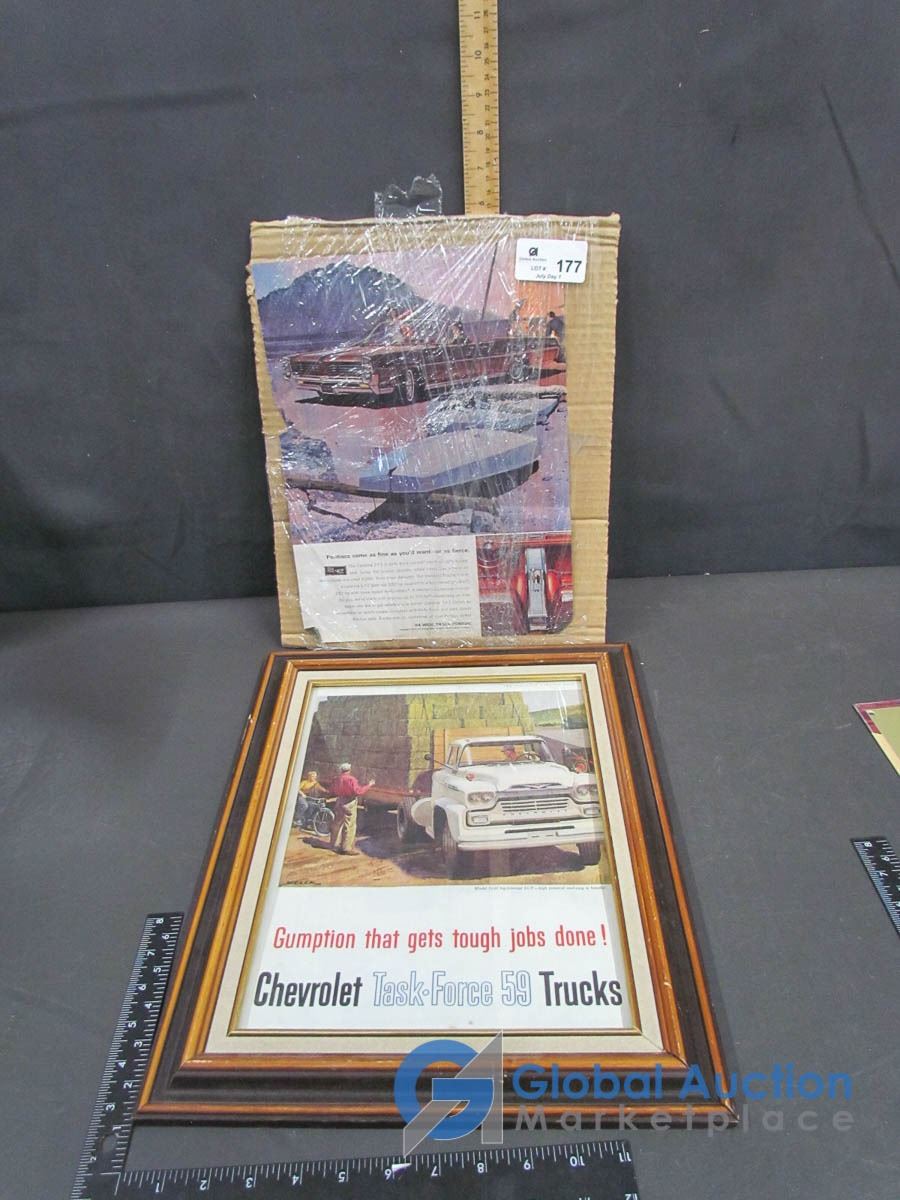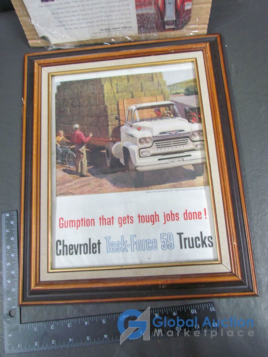 Framed Chevy Ad and Pontiac Paper Ad