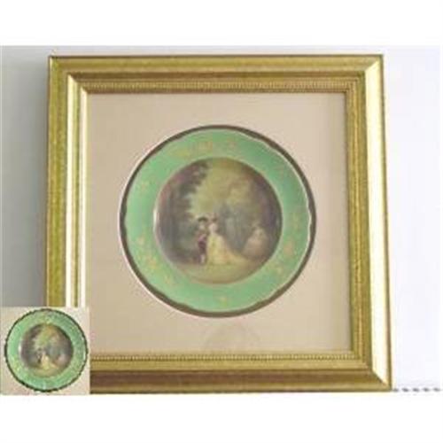 Framed China Plaque Decorated And Signed By Leslie Johnson The Plate Is Possibly Royal Doulton But Is Not Marked Centre Is A Hand Painted Scene Of A Ladt and Gentleman Strolling Arm In Arm With A Small Dog And Another Lady Seated The Border Is Shewsbury Green With Raised Paste Gilding