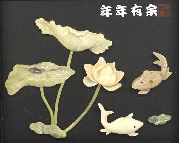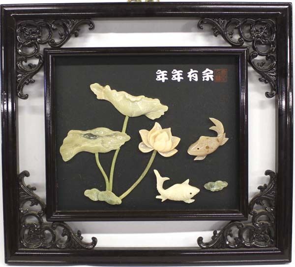 Framed Chinese Carved Jadeite Fish in Pond Picture, visual measures 10.5'' x 12'', overall measurement of 19'' x 17'', beautiful ornate frame