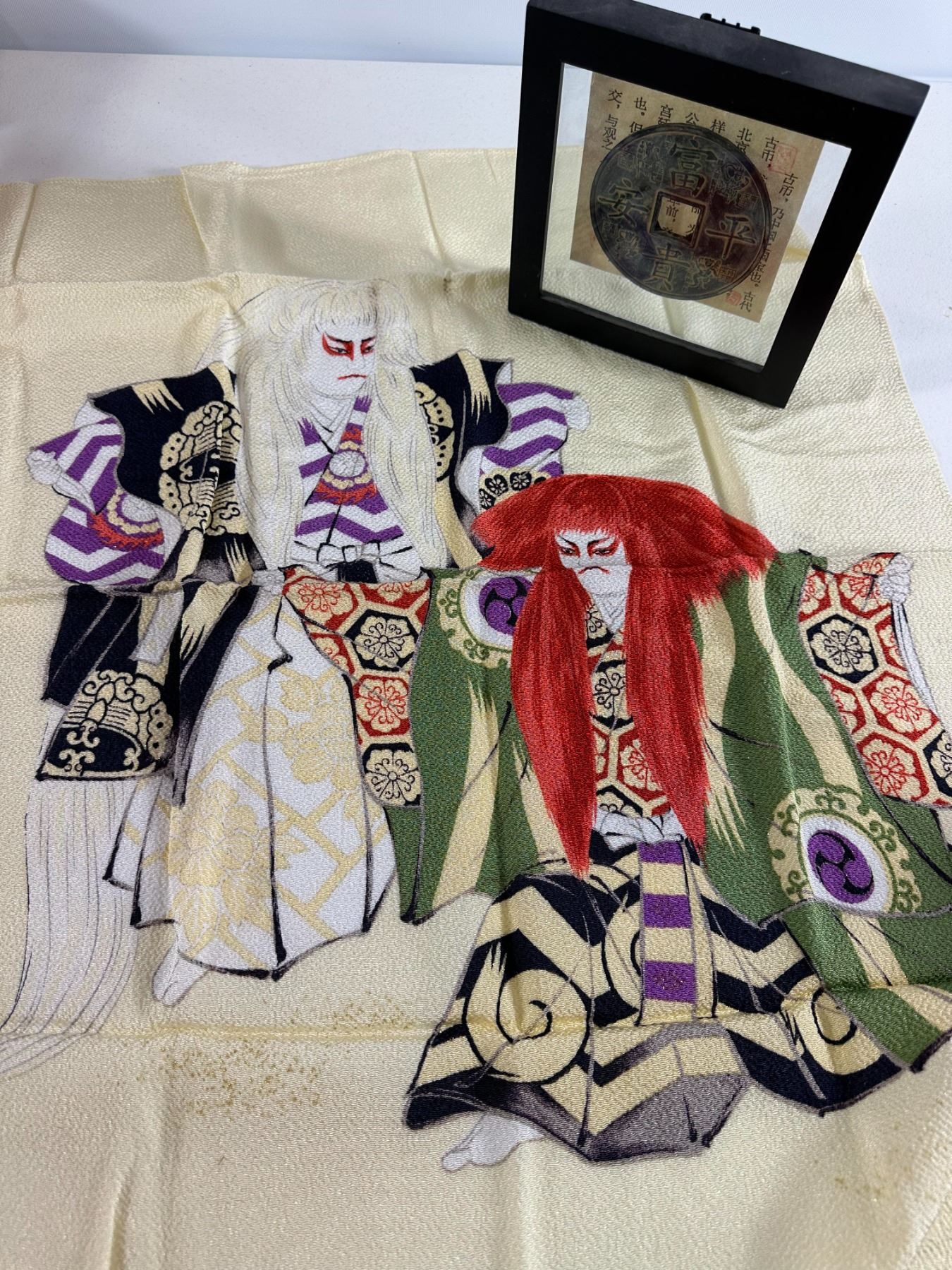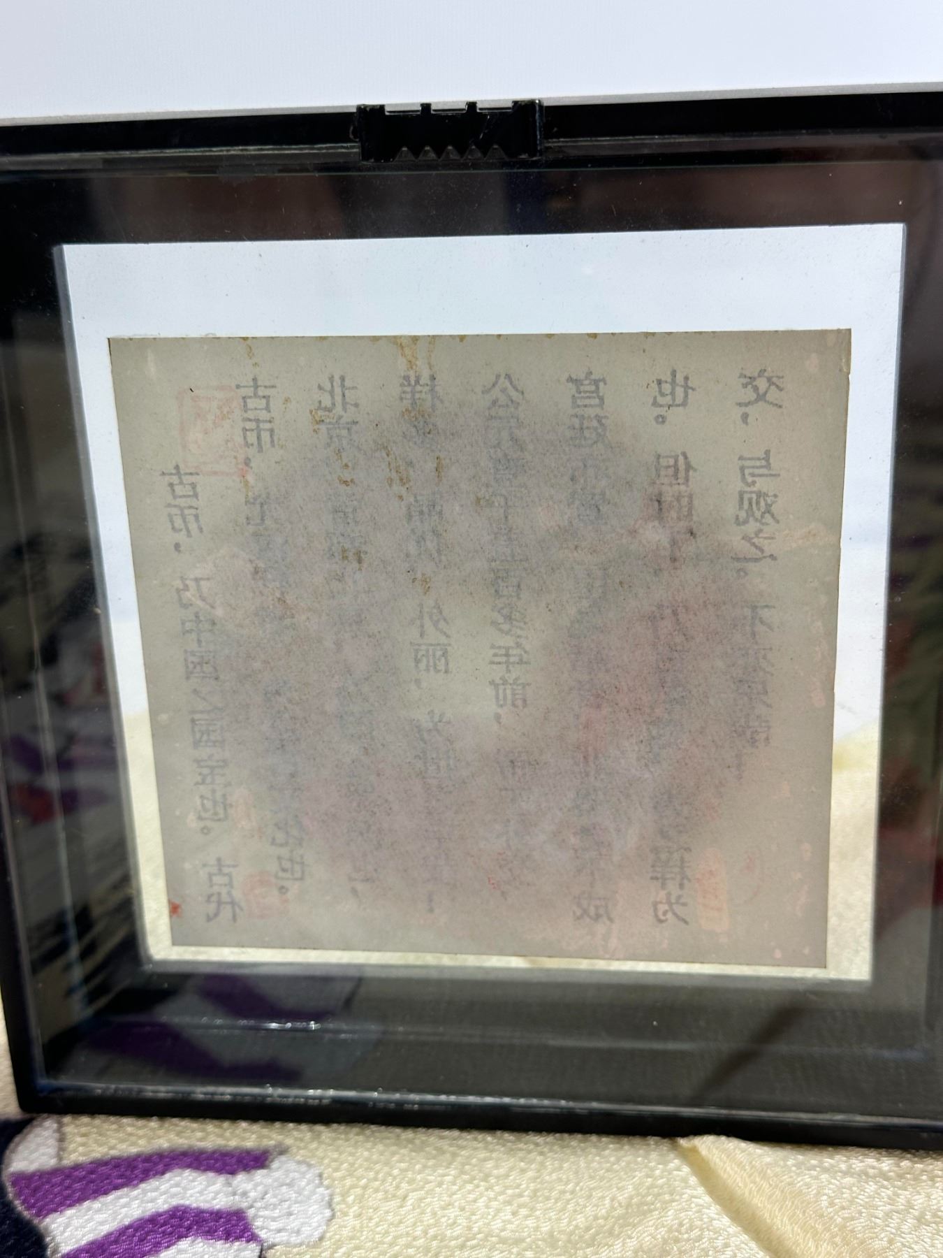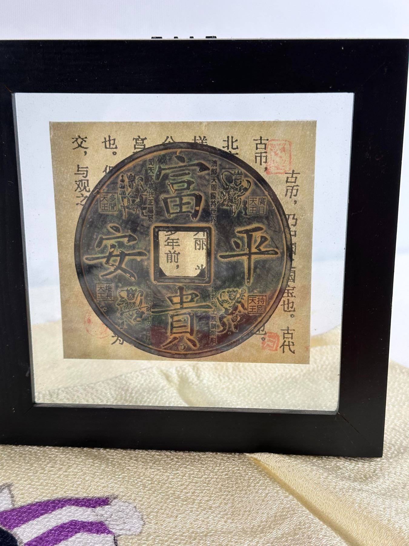 Decorative framed piece featuring an oversized replica of an ancient Chinese coin set against a calligraphy backdrop. Contemporary decor item Excellent condition.